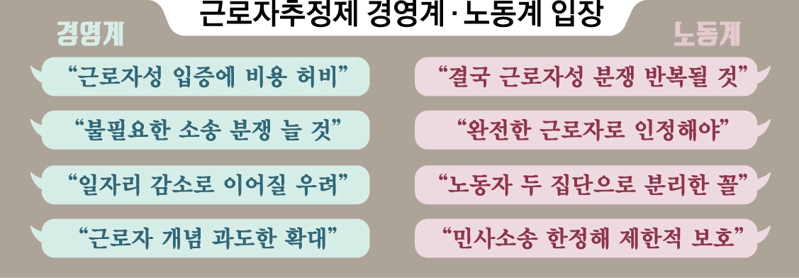 A. 일터 기본법 입법은 대체로 수용하는 분위기다. 다만 근로자 추정제 도입에는 거세게 반발하고 있다. 근로자성을 입증할 책임이 사업주에게로 넘어가면 각종 민사 소송에 시달릴 가능성이 커지기 때문이다. 또 최저임금 보장·퇴직금 지급·4대 보험 지원·연 15일 이상 연차 보장 등 근로기준법상 의무 이행이 확대되면 인건비 부담이 커지게 된다. 이런 배경에서 소상공인연합회는 “실질적인 계약과 관계없이 일단 근로자로 간주하고 이를 반박할 책임을 영세한 소상공인에게 지우는 것”이라며 “법률적 대응 능력이 약한 소상공인은 복잡한 근로자성 입증 과정에서 막대한 비용과 시간을 허비하게 될 것”이라고 주장했다. 한국외식업중앙회와 각종 플랫폼 업계는 “인건비 증가로 고용 절벽이 초래될 것”이라고 경고했다.