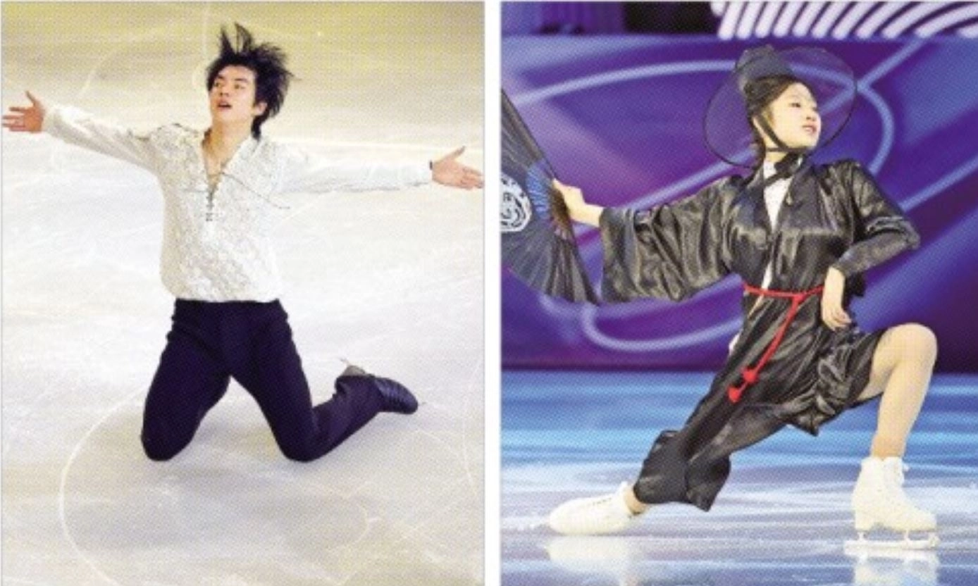 한국 피겨스케이팅 남자 싱글 차준환이 22일(한국시간) 이탈리아 밀라노 아이스스케이팅 아레나에서 열린 2026 밀라노·코르티나담페초 동계올림픽 피겨스케이팅 갈라쇼에서 국악인 송소희가 부른 ‘낫 어 드림’에 맞춰 연기를 펼치고 있다(왼쪽 사진). 여자 싱글 이해인은 넷플릭스 화제작 ‘케이팝 데몬 헌터스’ 삽입곡에 맞춰 저승사자 복장으로 연기를 펼쳐 관중들의 열광적인 호응을 끌어냈다(오른쪽 사진).