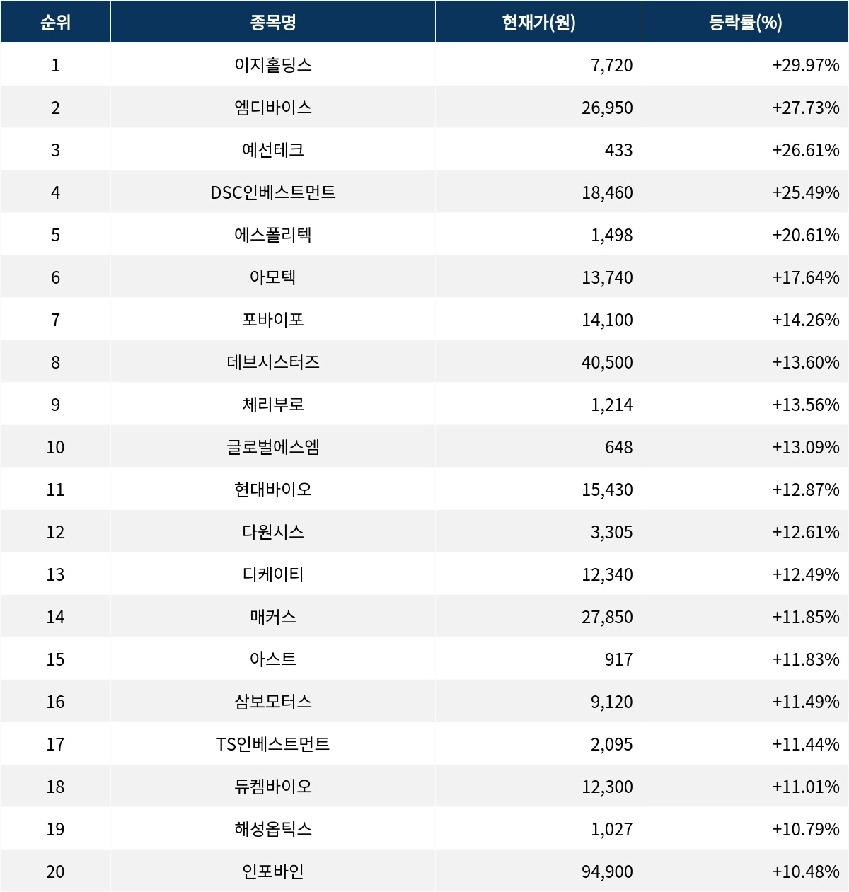 6위 아모텍(052710)은 현재가 1만 3740원으로 17.64% 급등 중이다. 7위 포바이포(389140)는 현재가 1만 4100원으로 14.26% 급등 중이다. 8위 데브시스터즈(194480)는 현재가 4만 500원으로 13.60% 급등 중이다. 9위 체리부로(066360)는 현재가 1214원으로 13.56% 급등 중이다. 10위 글로벌에스엠(900070)은 현재가 648원으로 13.09% 급등 중이다.