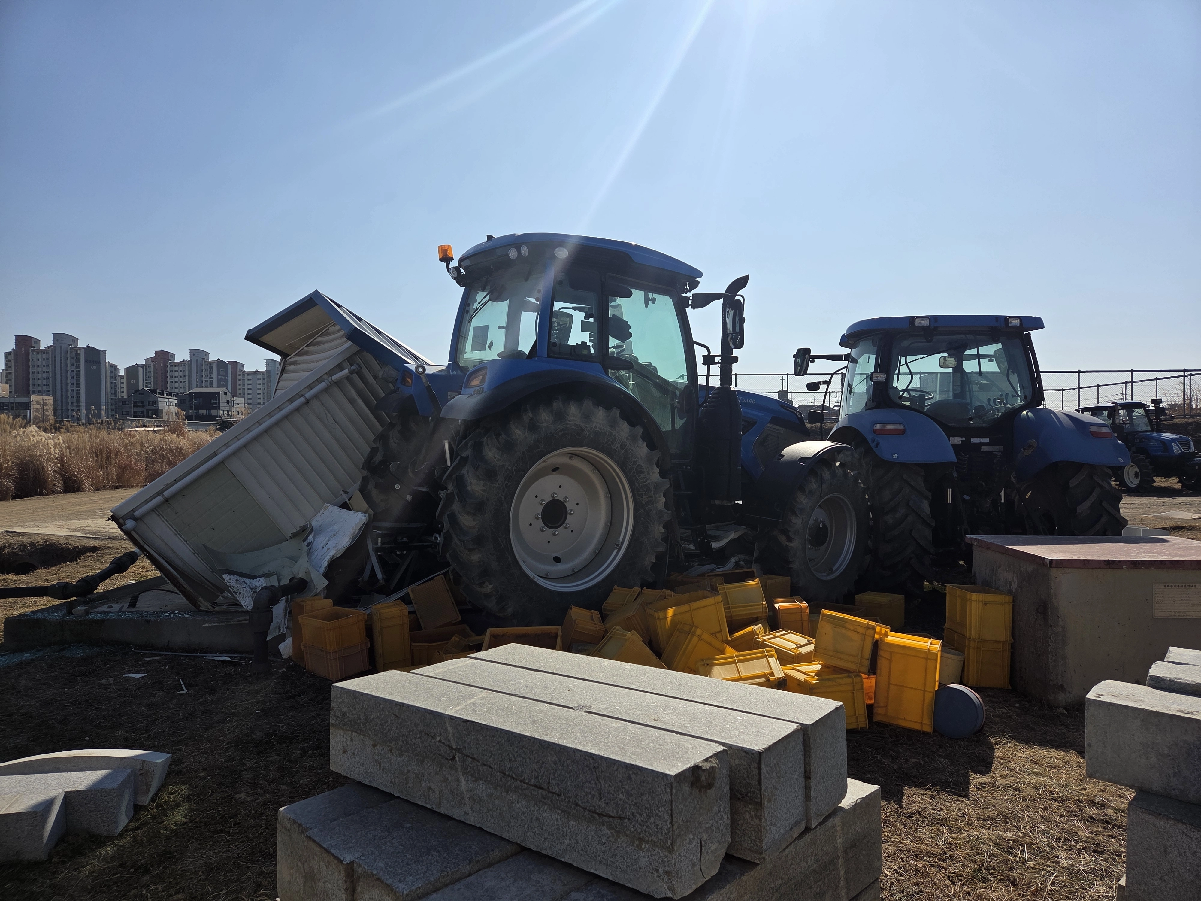 지난달 20일 경기 수원시 권선구 LS엠트론 연구소에서 트랙터 점검 작업을 하던 20대 여성 연구원 A씨가 숨졌다. 사진은 사고 당시 점검 중이던 트랙터와 충돌로 붕괴된 가건물 모습. 명종원 기자