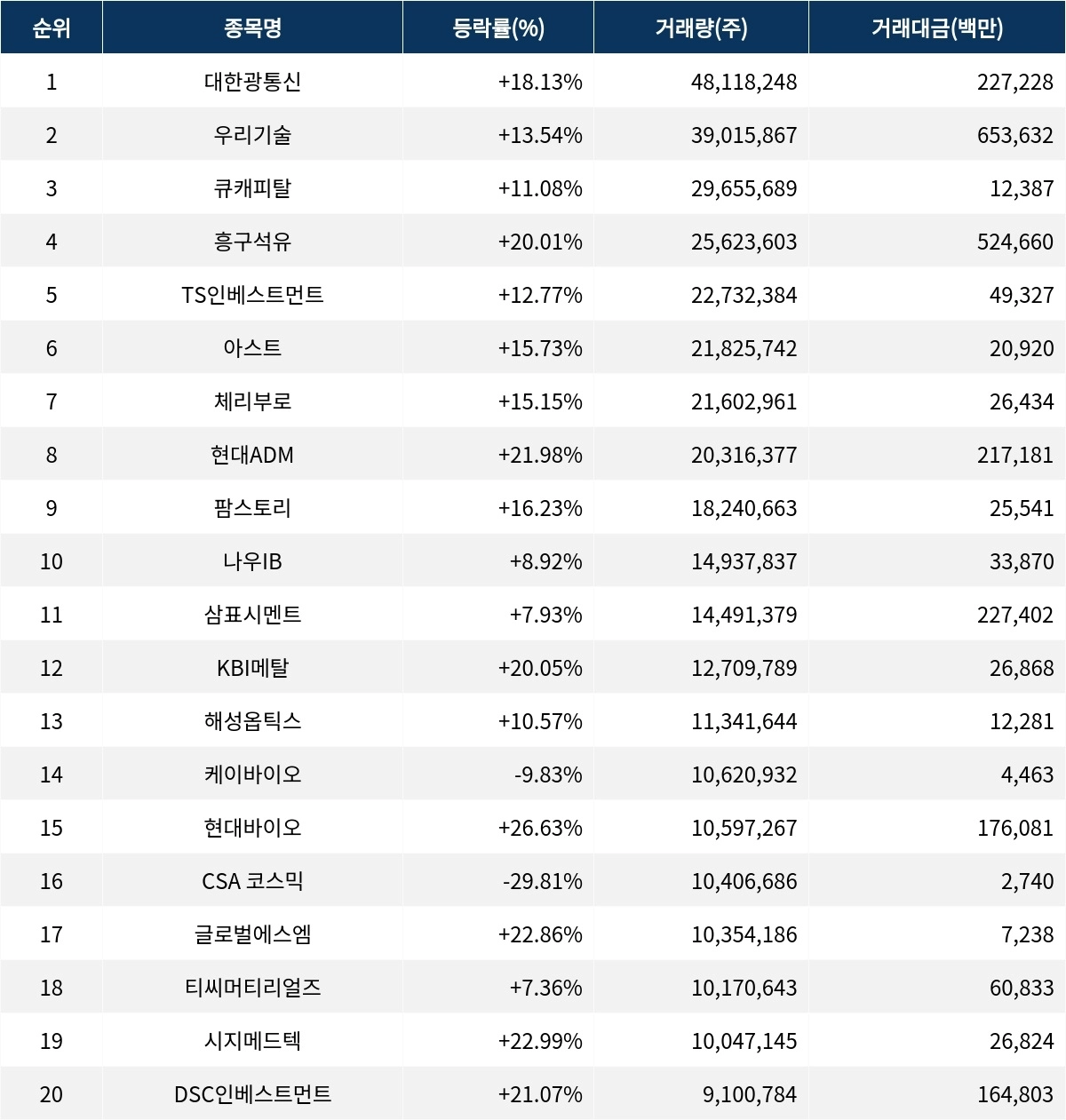 큐캐피탈(016600)은 2965만 5689주의 거래량을 기록하며, 현재 주가는 411원으로 등락률은 11.08% 상승하고 있다. 흥구석유(024060)는 2562만 3603주가 거래되며, 주가는 2만 2850원으로 20.01% 급등하고 있다. TS인베스트먼트(246690)는 2273만 2384주가 거래되며, 주가는 2120원으로 12.77% 상승하고 있다.