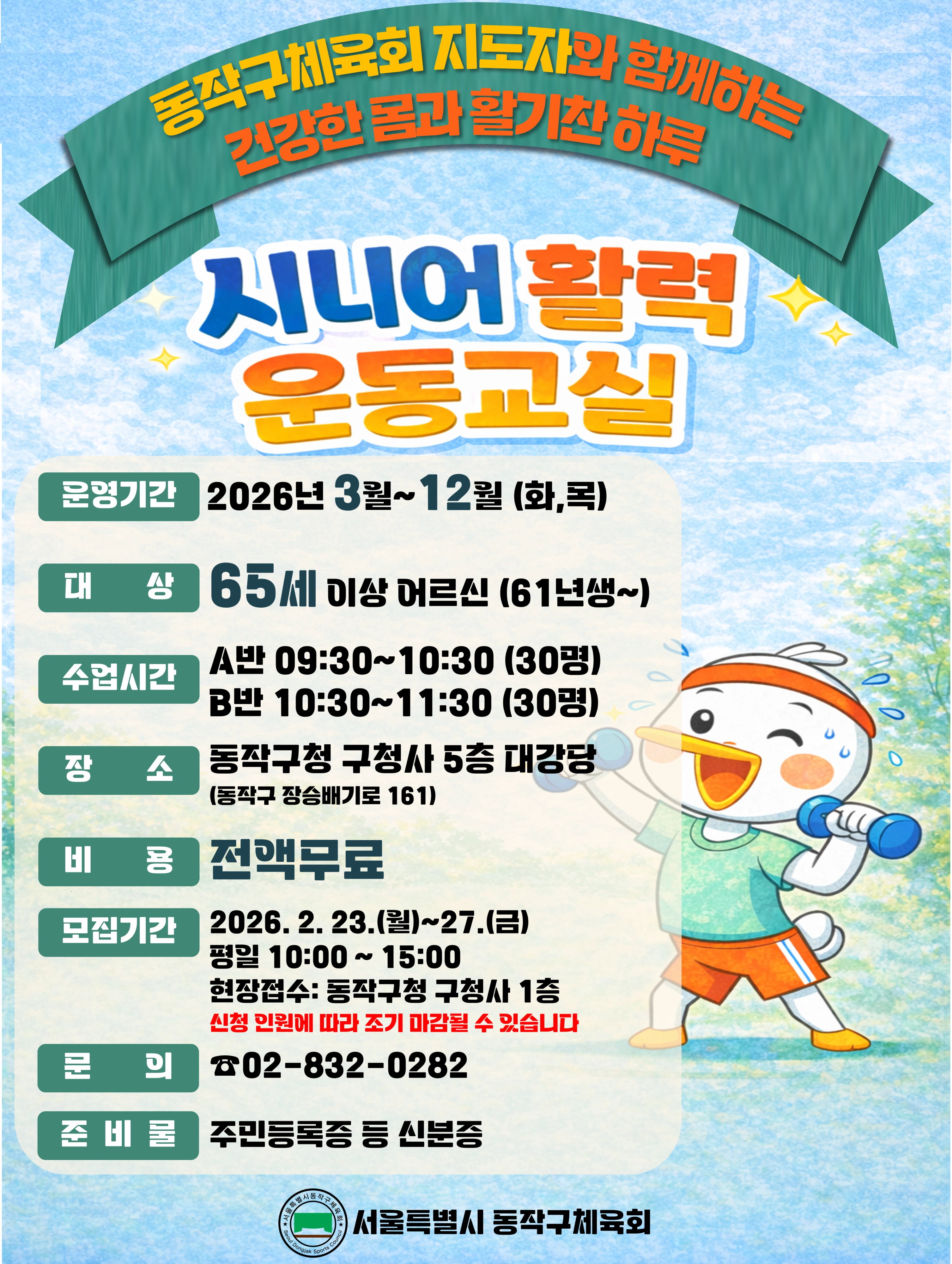 수업은 오는 3월 17일 개강식을 시작으로 11월까지 매주 화·목요일 동작구청 옛청사(장승배기로 161) 5층 대강당에서 진행된다. A반(오전 9시)과 B반(오전 10시)으로 나눠 각 1시간씩 운영되며, 동작구체육회 생활체육지도자가 안전하게 운동을 지도할 예정이다. 운동 경험이 적은 어르신도 부담 없이 참여할 수 있도록 소도구를 활용한 중강도 근력운동과 실내 유산소 운동 중심으로 구성됐다.