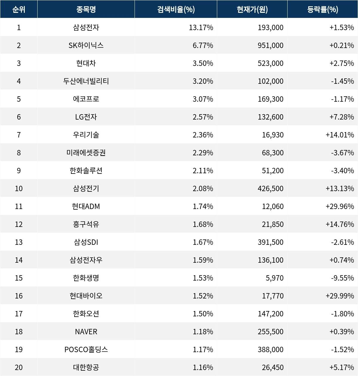 이어 검색비율 2위의 SK하이닉스(000660)는 상승률 0.21%로 보합 마감했다. 검색비율 3위의 현대차(005380)는 2.75% 상승 마감했다. 검색비율 4위 두산에너빌리티(034020)는 하락률 1.45%를 기록했다. 검색비율 5위 에코프로(086520)는 1.17% 하락하여 장을 마쳤다.