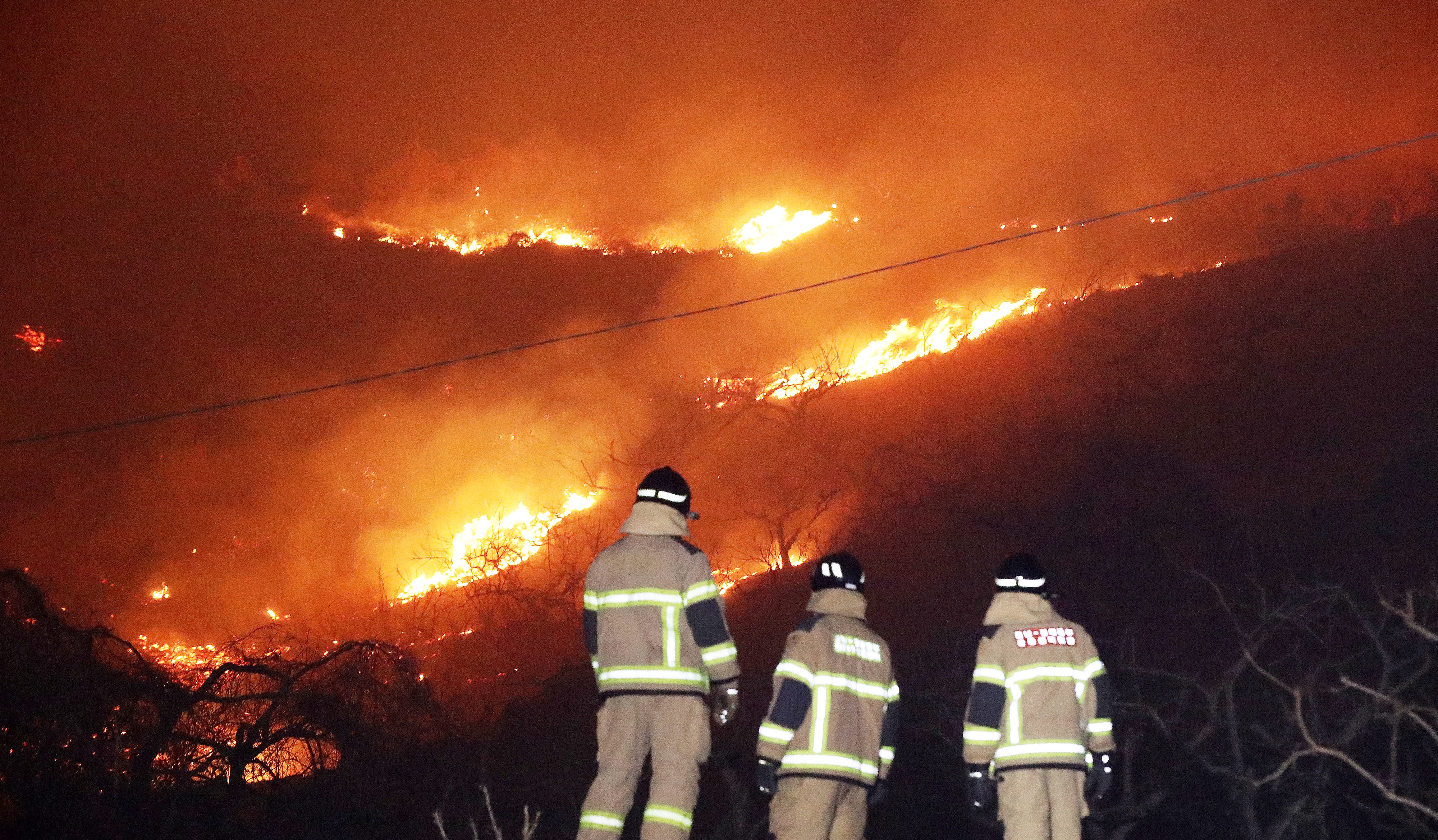 ‘산 중턱에서 불이 났다’는 신고를 받고 출동한 소방당국은 이날 오후 5시 관할 소방서 인력 전체가 출동하는 대응 1단계를 발령했다. 약 40분 뒤인 오후 5시 39분에는 국가소방동원령을 추가로 내렸다. 산림당국도 오후 5시 20분 산불 확산 대응 1단계를 발령하며 초기 진화에 나섰다.