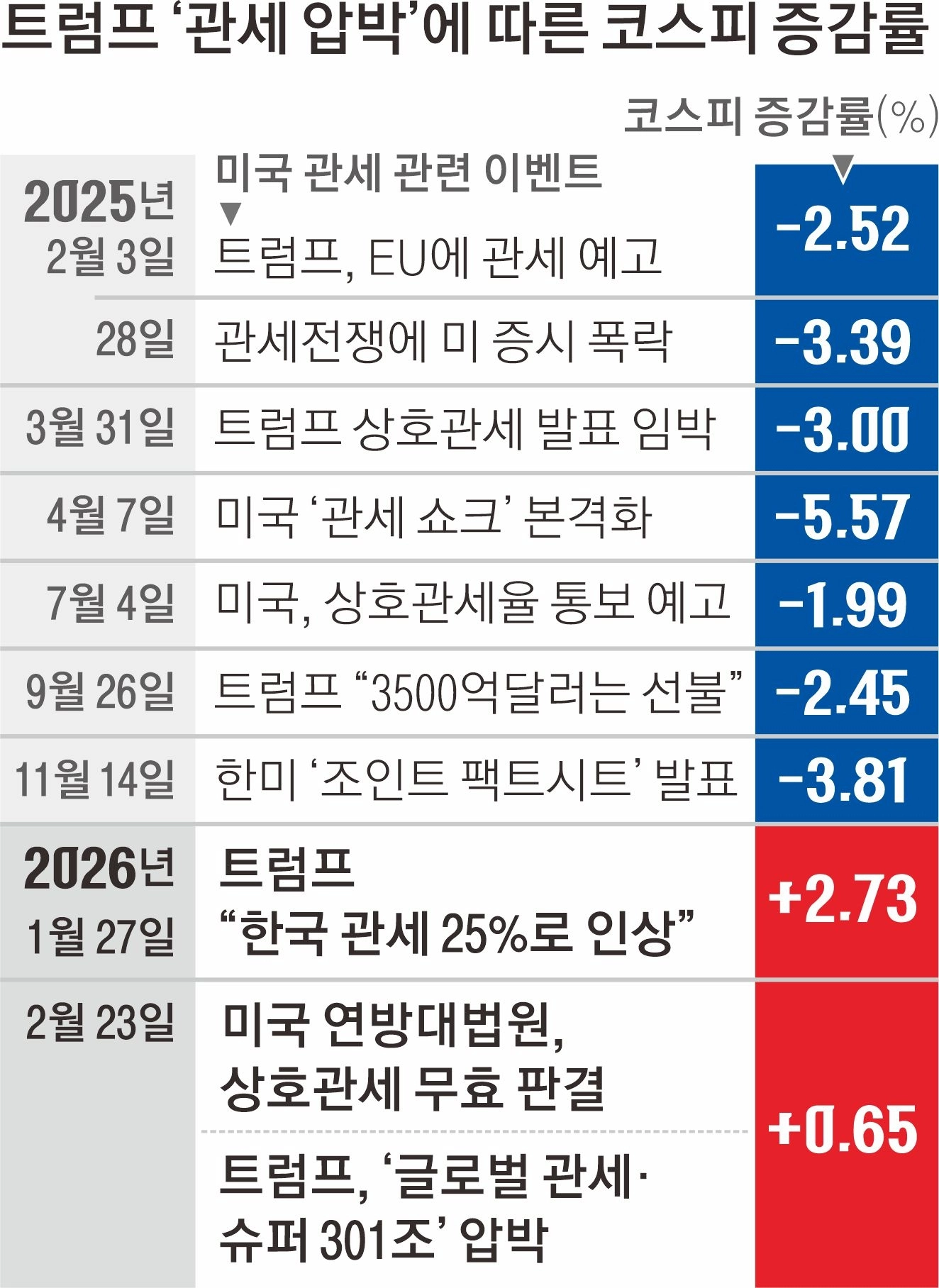 미국 연방대법원의 상호관세 무효 판결에 맞서 도널드 트럼프 미국 대통령이 ‘15% 글로벌 관세’, ‘무역법 301조(슈퍼 301조)’ 등 다채로운 보복성 카드를 꺼내 들었다. 지난해 같았으면 코스피와 원달러 환율이 출렁이며 경제가 휘청거릴 정도의 위협이다. 그러나 미국의 새로운 관세 압박이 있고 난 이후 첫 거래일인 23일 국내 금융시장은 지극히 안정된 모습을 보였다. 미국발 관세 쇼크를 버틸 수 있는 탄탄한 ‘경제 굳은살’이 생긴 모습이다.