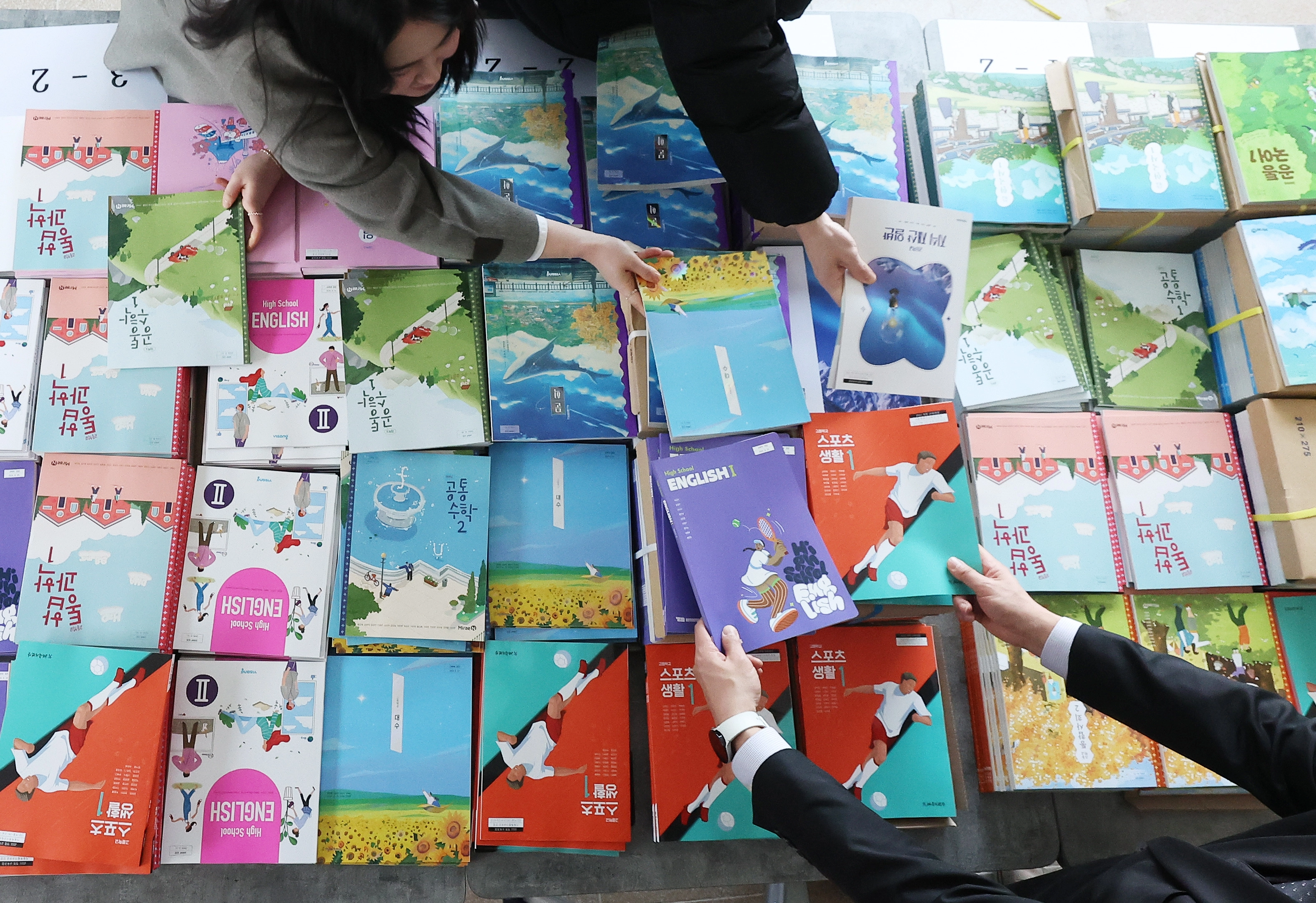 경기 수원시 팔달구 삼일공업고등학교 교직원들이 23일 새 학기 교과서 배부 준비를 하고 있다. 연합뉴스