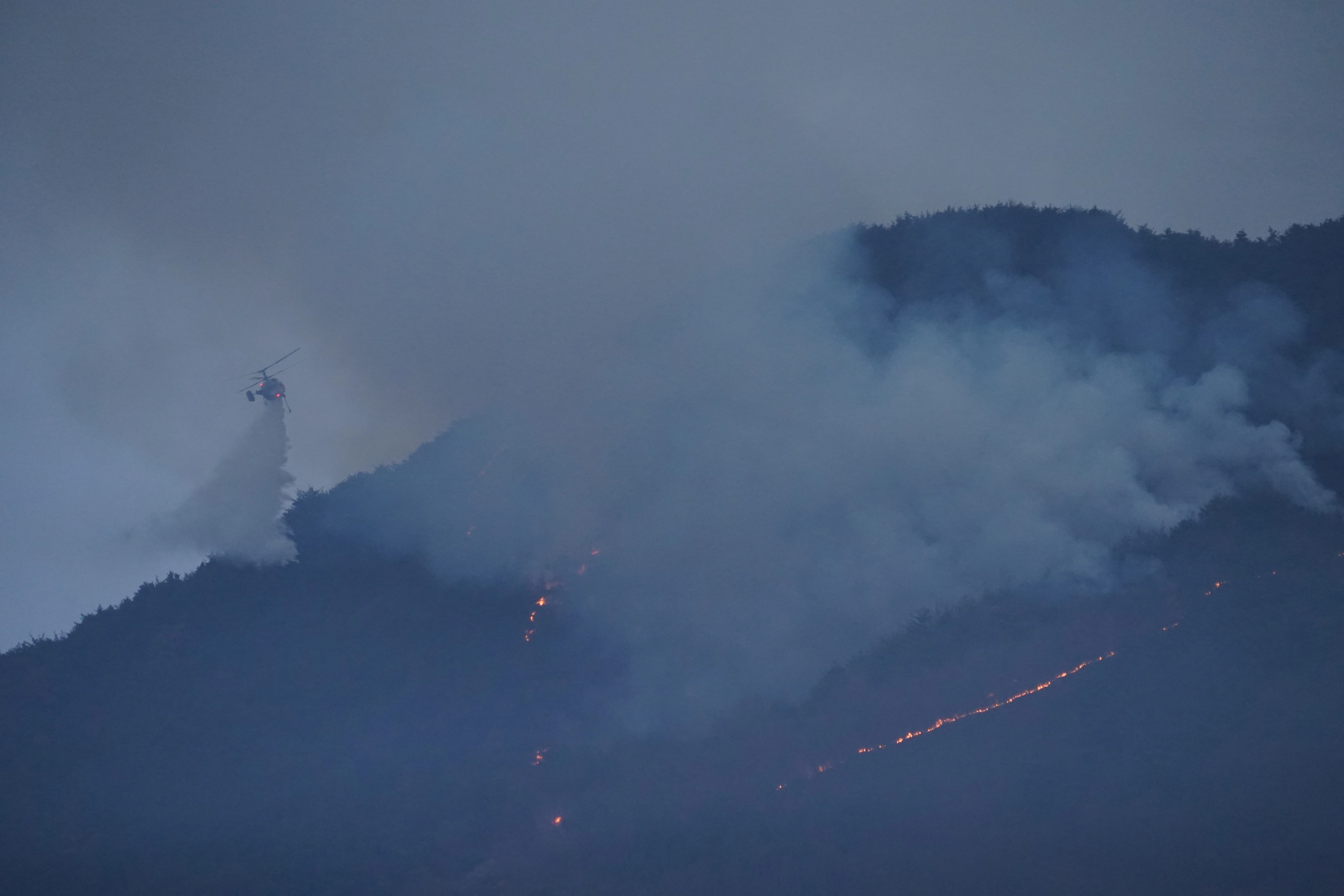 현장에는 바람이 다소 잦아든 상태지만 연무로 시정거리가 확보되지 않아 헬기 운용에 어려움을 겪고 있다. 산림·소방당국은 진화 헬기 34대와 진화 차량 159대, 인력 745명 등 가용 자원을 총동원해 진화 작업을 벌이고 있다.