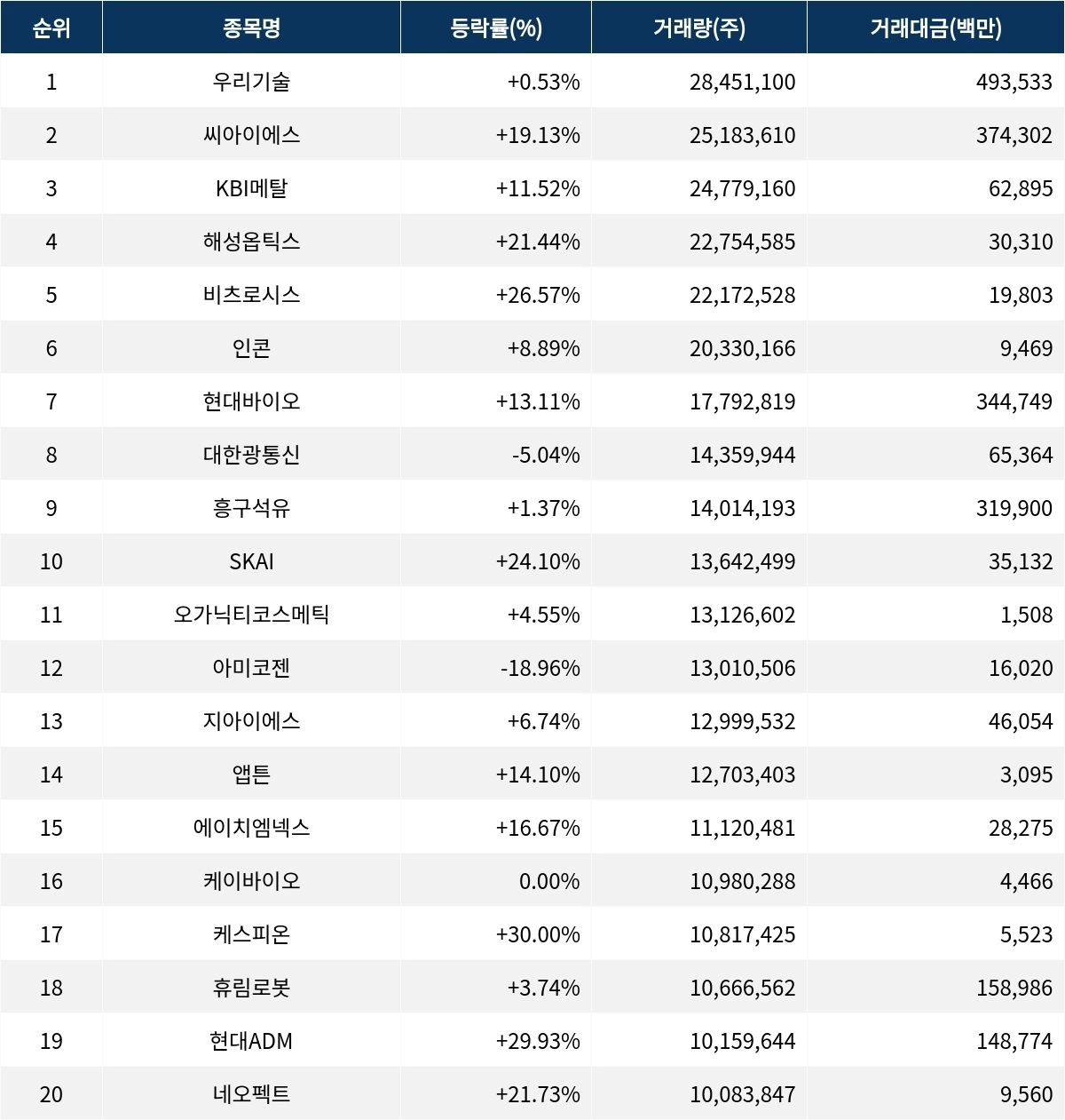 한편 거래량 상위 20위권 종목들은 오가닉티코스메틱(900300) ▲4.6%, 아미코젠(092040) ▼19.0%, 지아이에스(306620) ▲6.7%, 앱튼(270520) ▲14.1%, 에이치엠넥스(036170) ▲16.7%, 케이바이오(038530) 0.0%, 케스피온(079190) 상한가, 휴림로봇(090710) ▲3.7%, 현대ADM(187660) 상한가, 네오펙트(290660) ▲21.7% 등의 성적을 기록했다.