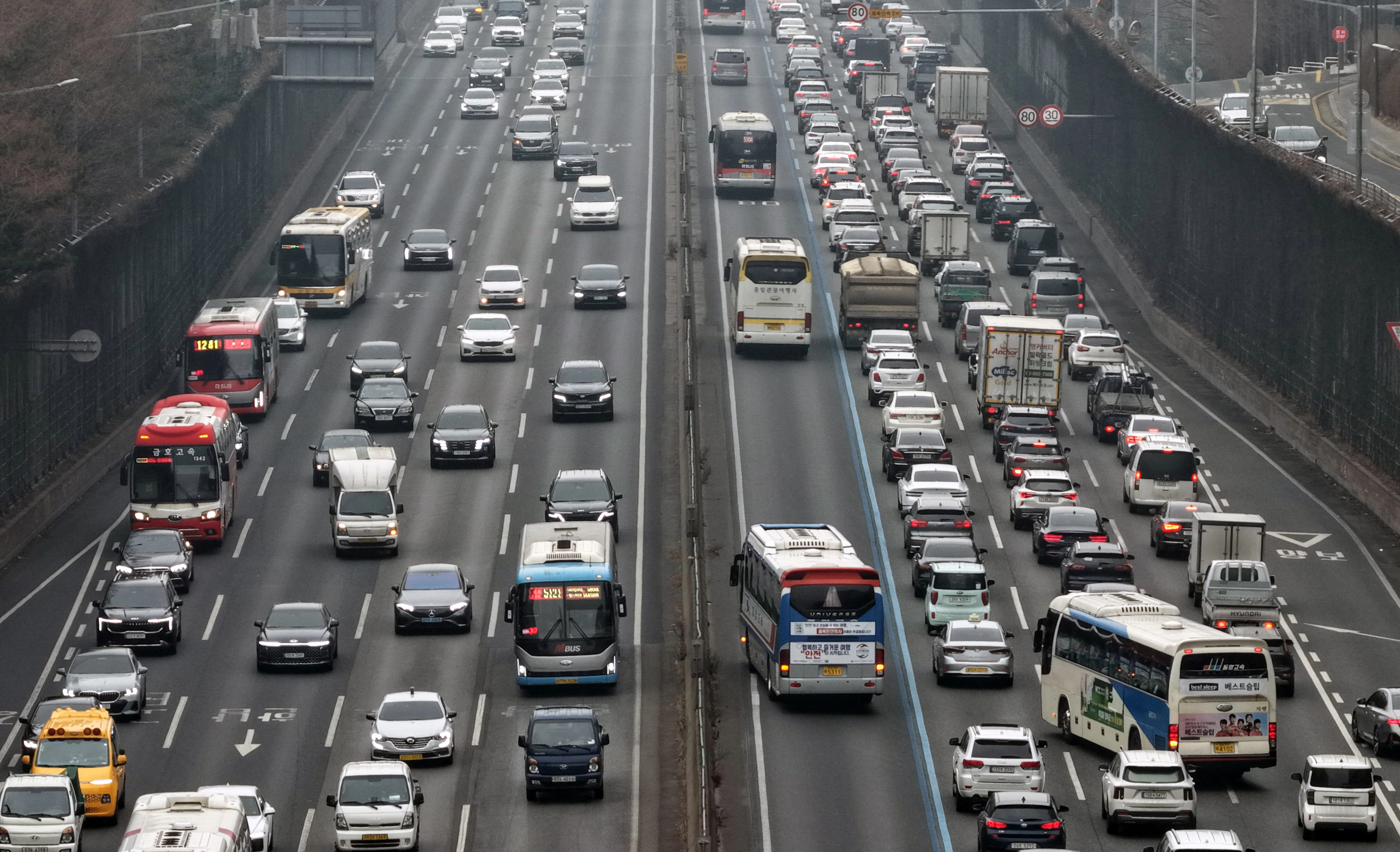 13일 서울 서초구 반포IC 인근 경부고속도로 차량 통행이 정체되고 있다. 2026.2.13. 연합뉴스