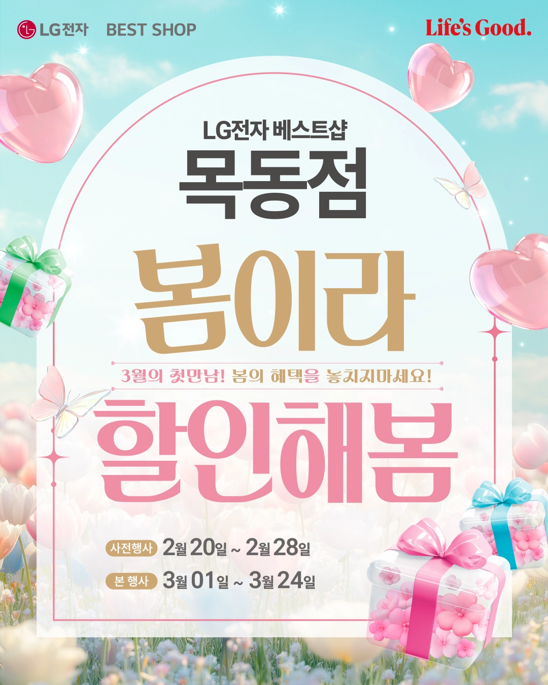 LG전자 베스트샵 목동점이 봄 시즌을 맞아 가전 구매 고객을 위한 봄맞이 세일 행사를 진행한다. 이번 행사는 사전 행사와 본행사로 나뉘어 운영되며, 사전 행사는 2월 20일부터 2월 28일까지, 본행사는 3월 1일부터 3월 24일까지 이어진다.