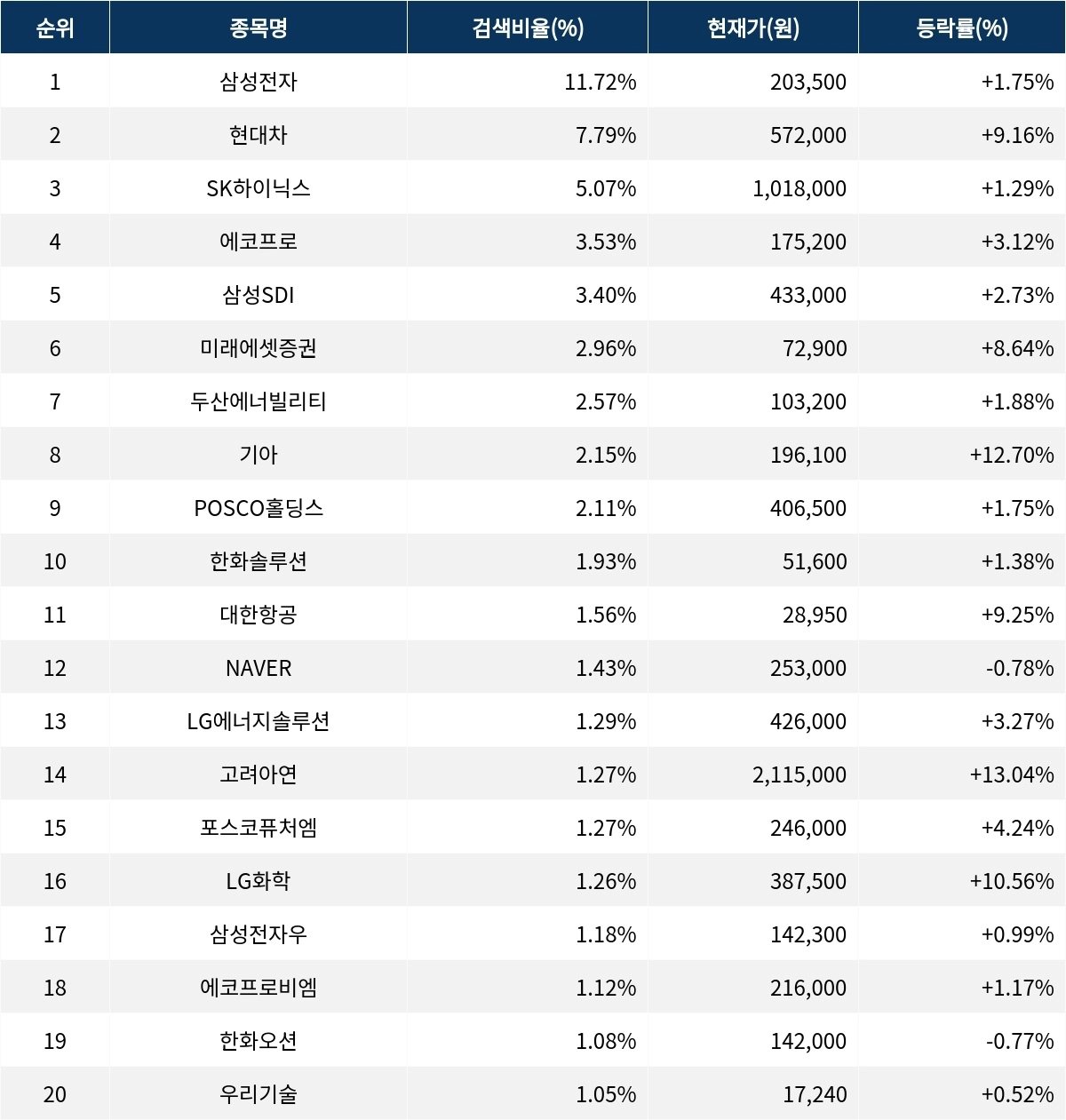 이어 검색 비율 2위의 현대차(005380)는 10.20% 오르며 상승 마감했다. 3위 SK하이닉스(000660)는 1.09% 상승 마감했다. 4위 에코프로(086520)는 1.17% 상승했다. 5위 삼성SDI(006400)는 4.27% 상승하며 거래를 마쳤다.