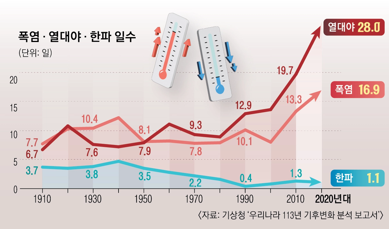 앞으로 기후위기 취약계층에 대한 지원은 더욱 중요해질 것으로 보인다. 지난해 12월 기상청이 발간한 ‘우리나라 113년 기후변화 분석 보고서’를 보면 2020년대 들어 폭염 일수는 산업화 이전인 1910년대 때보다 2.2배, 열대야 일수는 4.2배로 늘었다. 연간 강수량은 줄었지만 한 번 내릴 때 집중적으로 쏟아지는 폭우와 폭설 빈도는 더 늘었다. 특히 2024년 연평균 기온과 2025년 여름철 평균 기온이 역대 1위를 경신하는 등 최근 기후변화의 속도는 더욱 빨라지고 있다. 정부는 탄소 배출을 줄이는 기후변화 ‘완화’정책만큼 기후위기 취약계층 지원 등 이미 변해버린 기후 속에서 잘 살아가기 위한 ‘적응’정책에도 무게를 싣고 있다.