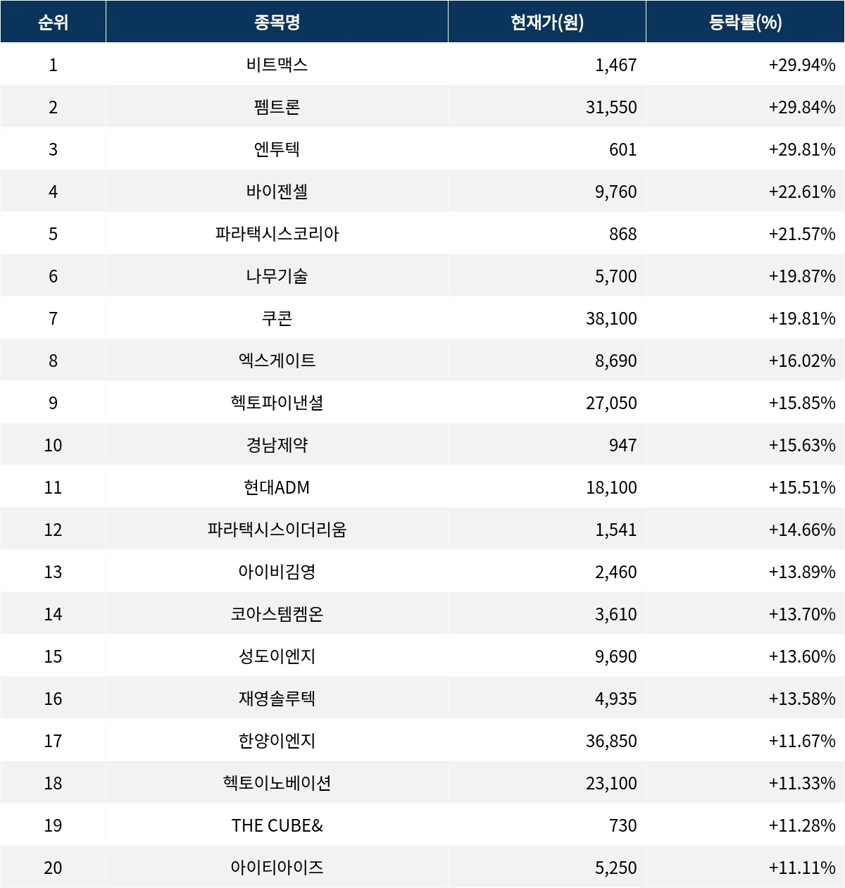 6위 나무기술(242040)은 현재가 5700원으로 19.87% 상승 중이다. 7위 쿠콘(294570)은 현재가 3만 8100원으로 19.81% 상승 중이다. 8위 엑스게이트(356680)는 현재가 8690원으로 16.02% 상승 중이다. 9위 헥토파이낸셜(234340)은 현재가 2만 7050원으로 15.85% 상승 중이다. 10위 경남제약(053950)은 현재가 947원으로 15.63% 상승 중이다.