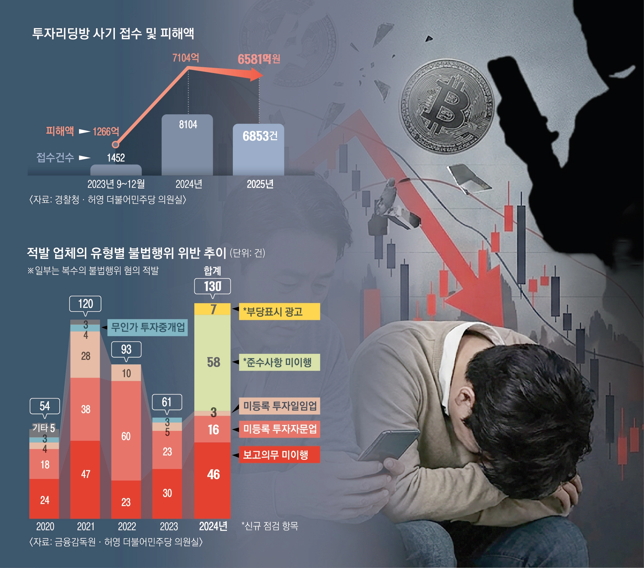 리딩방은 신고 업체와 미등록 영업이 뒤섞인 채 이름만 바꿔 확산 중이다. 금융감독원이 허 의원실에 제출한 ‘유사투자자문업자 영업 실태 점검 및 적발 현황’을 보면 최근 5년간 점검·적발 규모가 크게 늘었다. 2020년 351곳이던 점검 대상은 2024년 745곳으로 2.1배 증가했고, 적발 업체도 49곳에서 112곳으로 약 2.3배 확대됐다. 같은 기간 적발 업체의 위반 혐의 건수 역시 54건에서 130건으로 2.4배 늘었다. 2024년 위반 유형은 ▲준수사항 미이행(58건) ▲보고의무 미이행(46건) ▲미등록 투자자문업(16건) ▲부당표시 광고(7건) ▲미등록 투자일임업(3건) 순이었다. 행정 의무 위반과 무자격 영업이 반복적으로 적발되고 있는 셈이다.