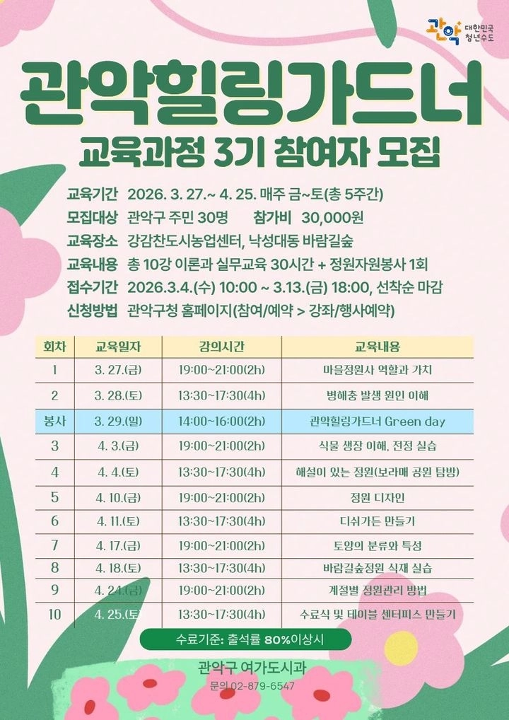 서울 관악구는 식물과 정원에 관심 있는 주민을 대상으로 ‘2026년 관악 힐링 가드너 3기 양성과정’을 운영한다고 27일 밝혔다.