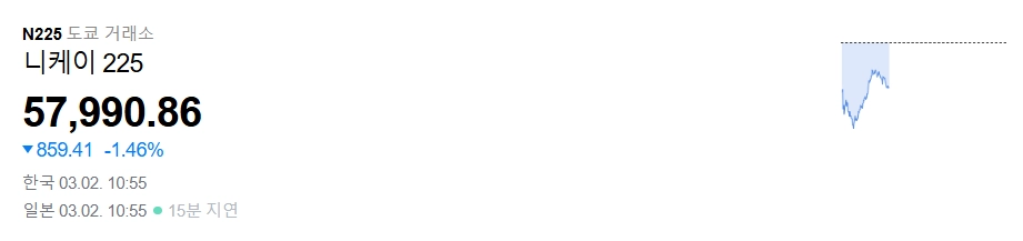 2일 도쿄증시에서 닛케이225 평균주가(닛케이지수)는 오전 10시 55분 기준 전 거래일 종가보다 859.41 포인트(1.46%) 내린 5만 7990.86을 기록 중이다. 닛케이225 지수는 오전 9시 30분 1500 포인트 이상 떨어진 5만 7285를 기록했다. 장중 하락률은 약 2.7%까지 확대됐다.