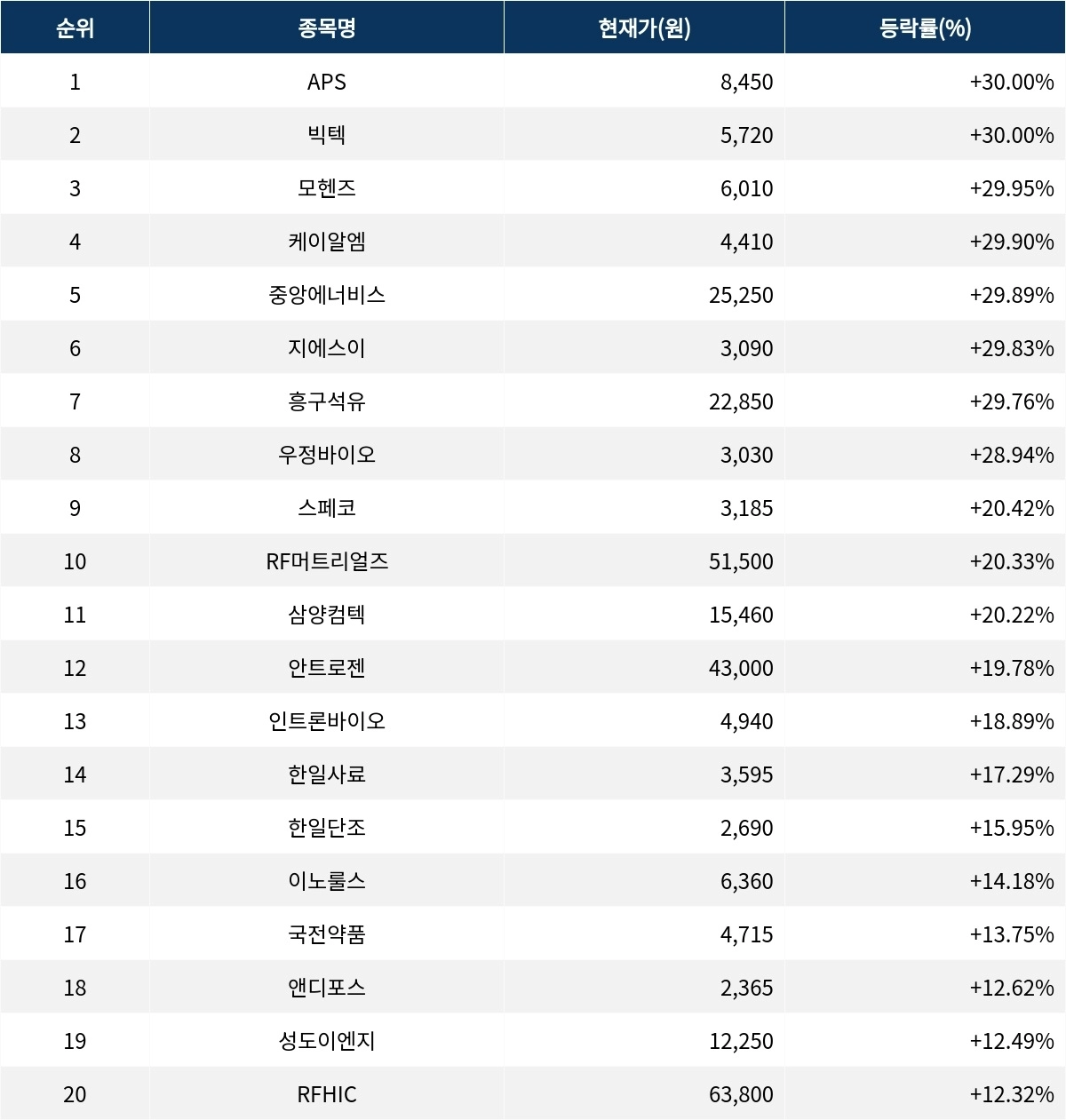 6위 지에스이(053050)는 종가 3090원으로 29.83% 상승 마감했다. 7위 흥구석유(024060)는 종가 2만 2850원으로 29.76% 상승 마감했다. 8위 우정바이오(215380)는 종가 3030원으로 28.94% 상승 마감했다. 9위 스페코(013810)는 종가 3185원으로 20.42% 상승 마감했다. 10위 RF머트리얼즈(327260)는 종가 5만 1500원으로 20.33% 상승 마감했다.
