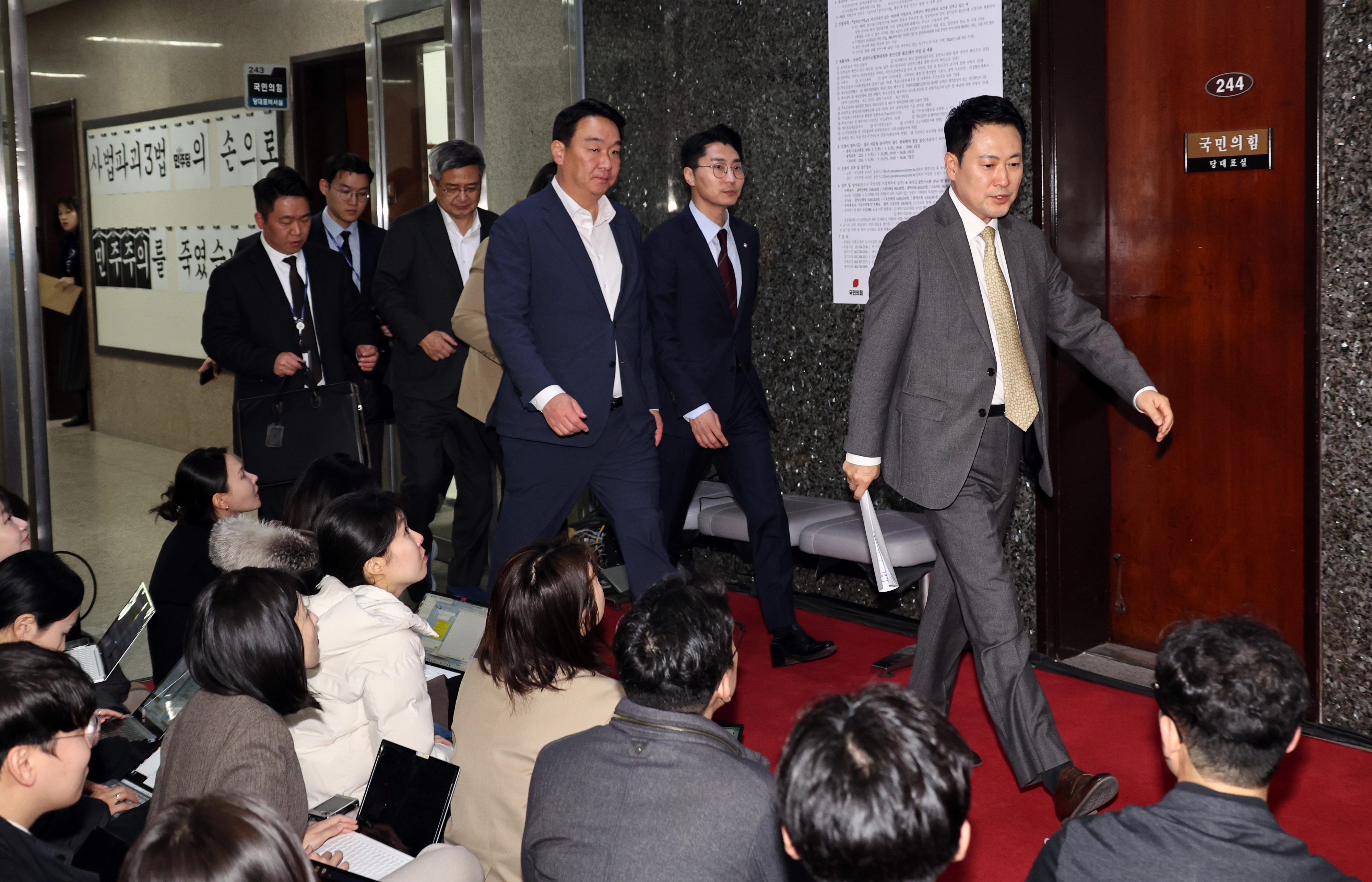 장동혁 국민의힘 대표가 4일 오후 서울 여의도 국회에서 국민의힘 소장파 모임 ‘대안과미래’ 간사인 이성권 의원과의 면담을 마친 뒤 이동하고 있다. 뉴시스