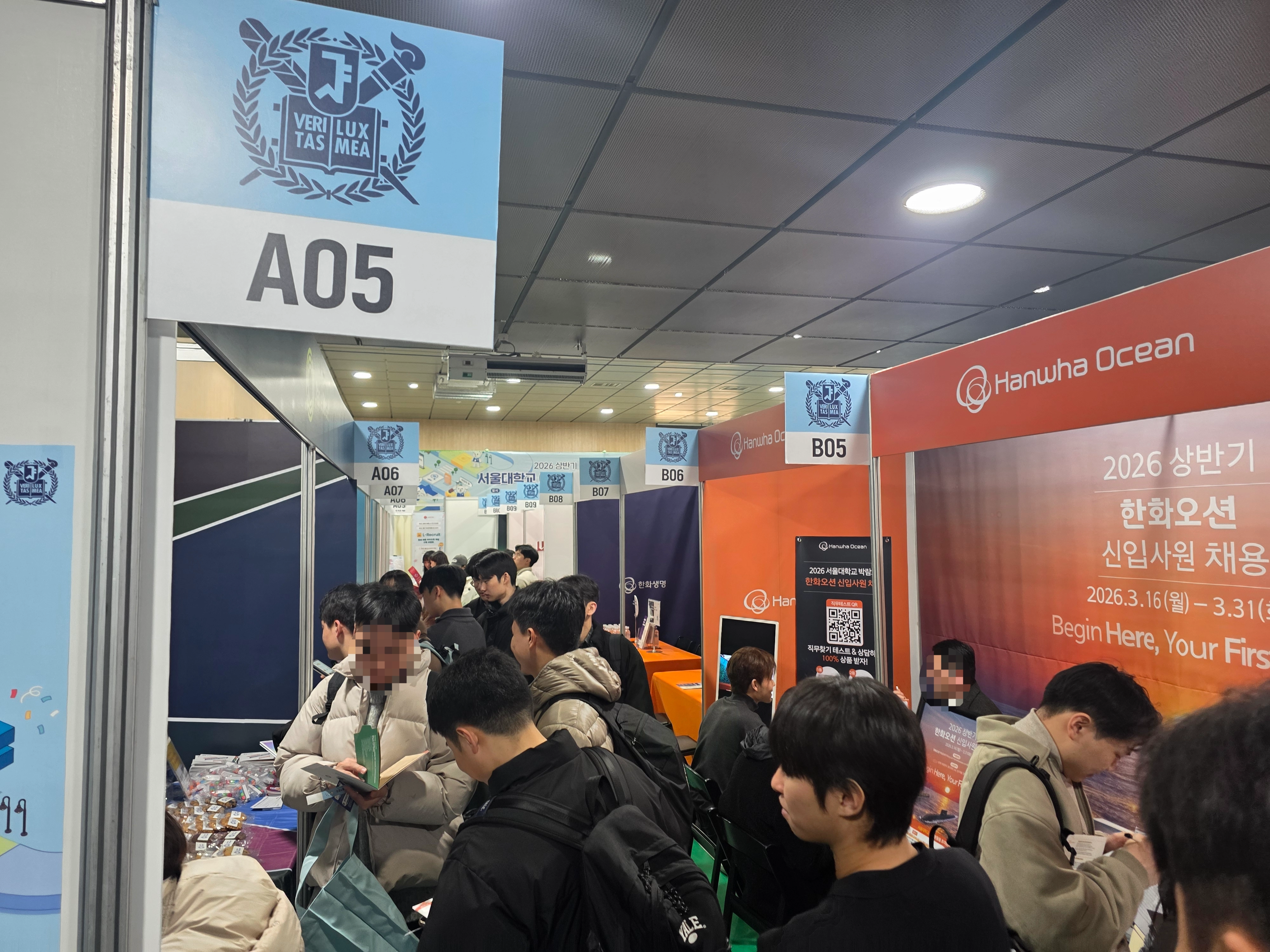 4일 서울대 학생들을 대상으로 열린 ‘2026 상반기 이공계 채용박람회’ 현장은 점심시간임에도 복도를 지나가기 힘들 정도로 북적였다. 약 80개 기업 부스에는 학생들이 길게 줄을 서서 상담을 기다리는 등 취업을 향한 열기로 뜨거웠다.