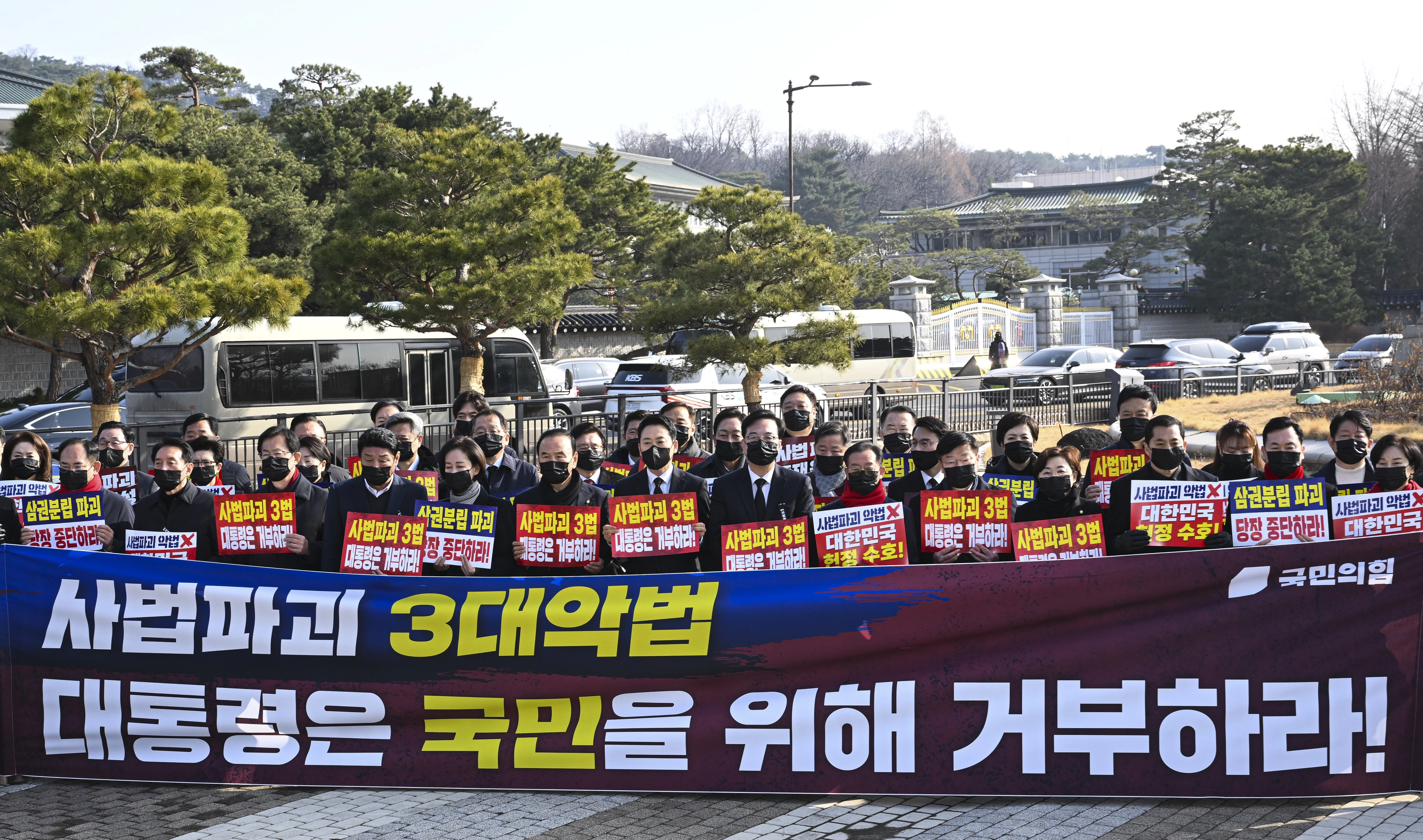 국민의힘은 이날 국무회의가 열리는 청와대 인근에서 이재명 대통령의 사법 3법(법왜곡죄·재판소원제·대법관 증원법)에 대한 재의요구권 행사를 재차 요구했다. 이 대통령은 이날 국무회의에서 사법 3법을 원안대로 의결했다.