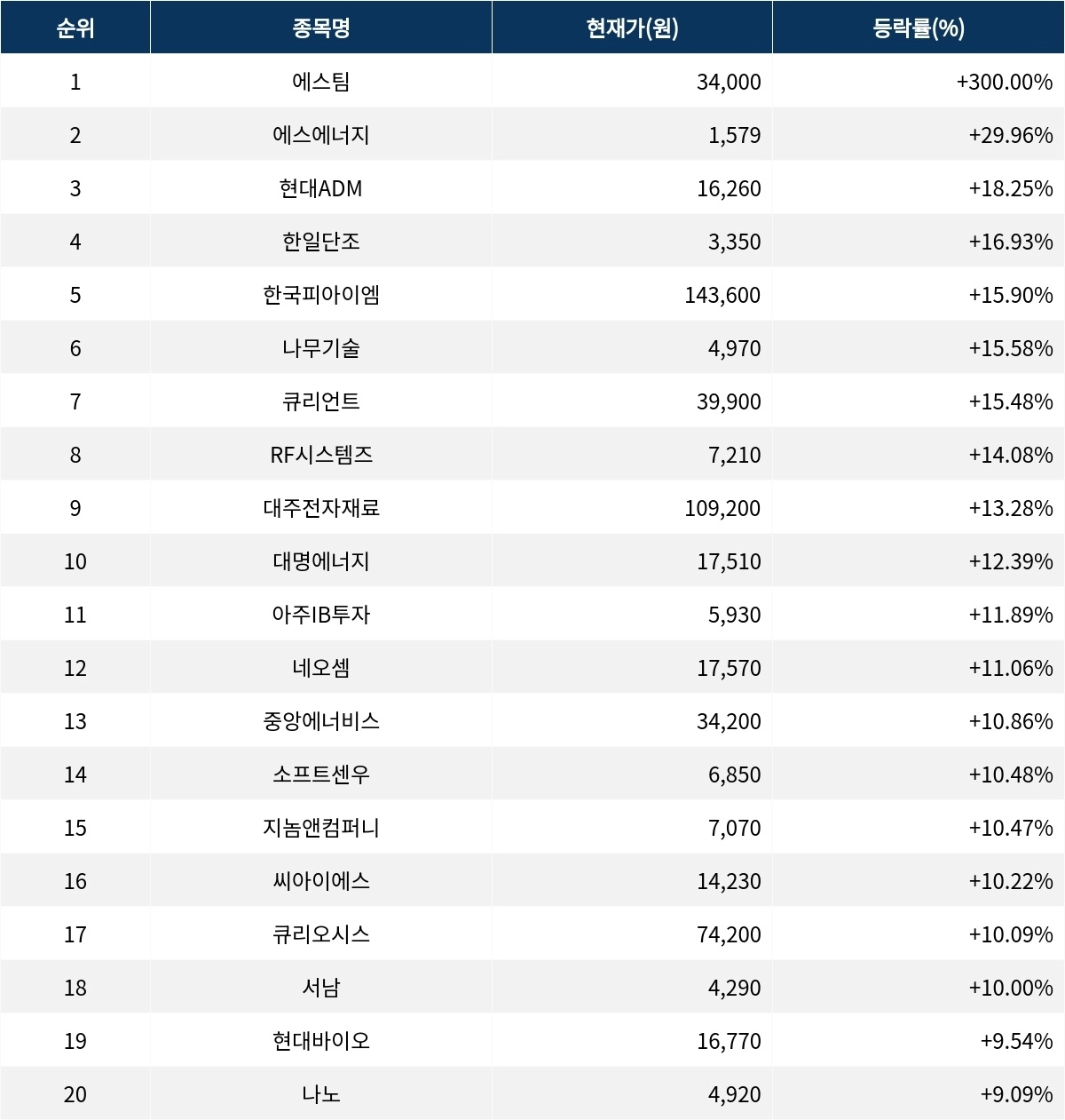 이어 상승률 2위 에스에너지(095910)는 현재가 1579원으로 주가가 30.0% 상한가를 기록하고 있다. 상승률 3위 현대ADM(187660)은 현재 1만 6260원으로 18.3% 급등하고 있다. 상승률 4위 한일단조(024740)는 16.9% 상승하며 3350원에 거래되고 있다. 상승률 5위 한국피아이엠(448900)은 15.9%의 상승세를 타고 14만 3600원에 거래되고 있다.