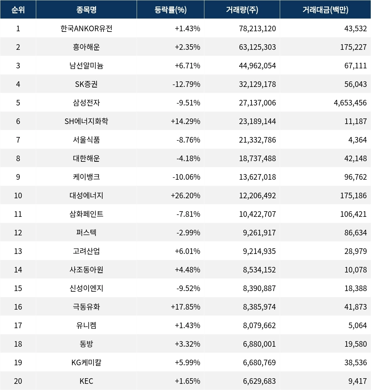 남선알미늄(008350)은 현재가 1431원으로 6.7% 상승하며 거래량 4496만 2054주를 기록 중이다. SK증권(001510)은 1684원으로 12.8% 하락세를 보이며 거래량은 3212만 9178주에 달한다. 삼성전자(005930)는 17만 300원으로 9.5% 하락하며 거래량은 2713만 7006주를 기록 중이다. SH에너지화학(002360)은 480원으로 14.3% 상승하며 거래량 2318만 9144주를 기록하고 있다. 서울식품(004410)은 198원으로 8.8% 하락하며 거래량 2133만 2786주를 기록 중이다. 대한해운(005880)은 현재가 2180원으로 4.2% 하락하며 거래량은 1873만 7488주를 기록하고 있다. 케이뱅크(279570)는 6970원으로 10.1% 하락하며 거래량은 1362만 7018주에 달한다. 대성에너지(117580)는 1만 4980원으로 26.2% 상승하며 거래량 1220만 6492주를 기록 중이다.