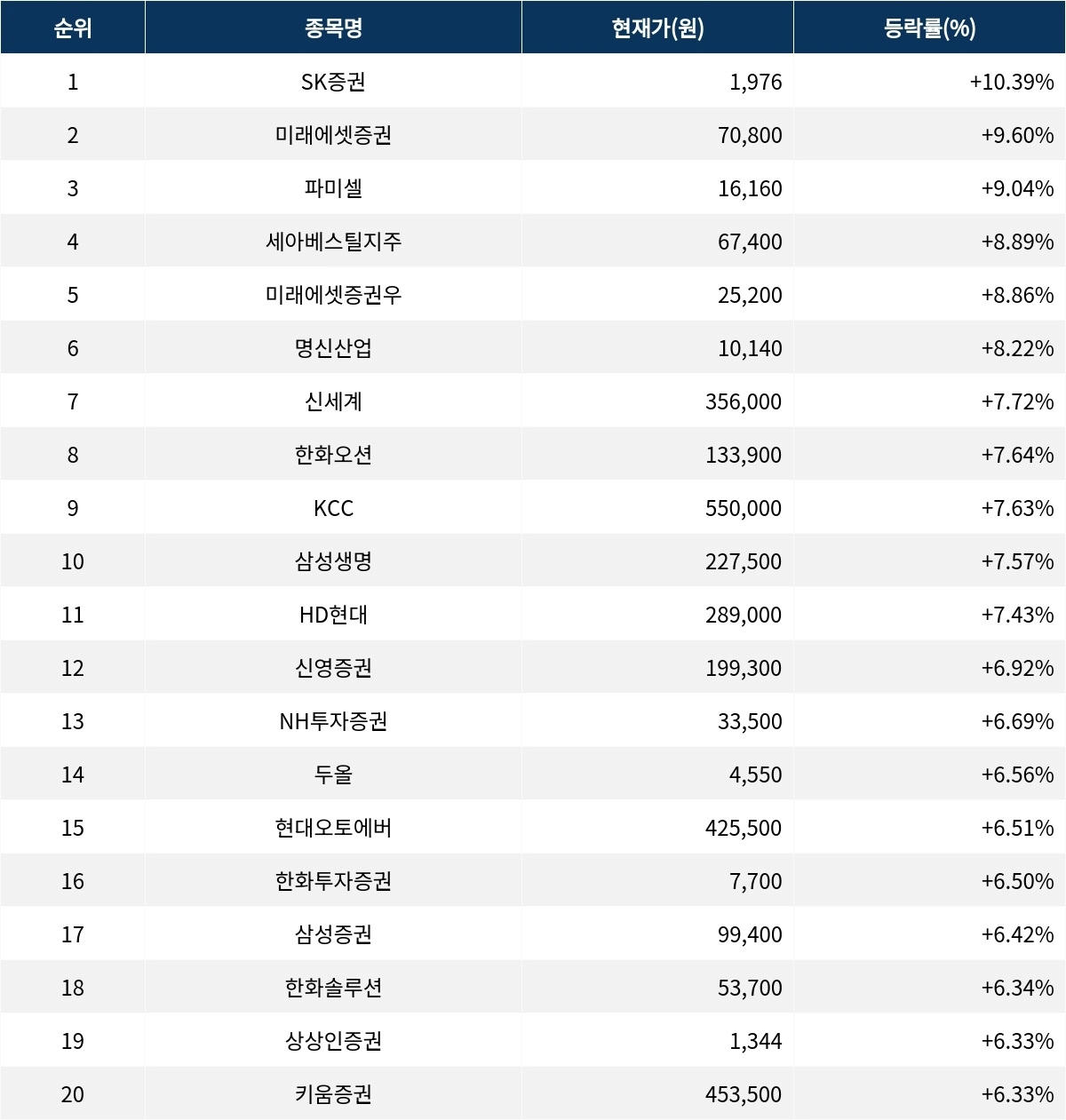 6위 명신산업(009900)은 현재가 1만 140원으로 8.22% 상승 중이다. 7위 신세계(004170)는 현재가 35만 6000원으로 7.72% 상승 중이다. 8위 한화오션(042660)은 현재가 13만 3900원으로 7.64% 상승 중이다. 9위 KCC(002380)는 현재가 55만원으로 7.63% 상승 중이다. 10위 삼성생명(032830)은 현재가 22만 7500원으로 7.57% 상승 중이다.