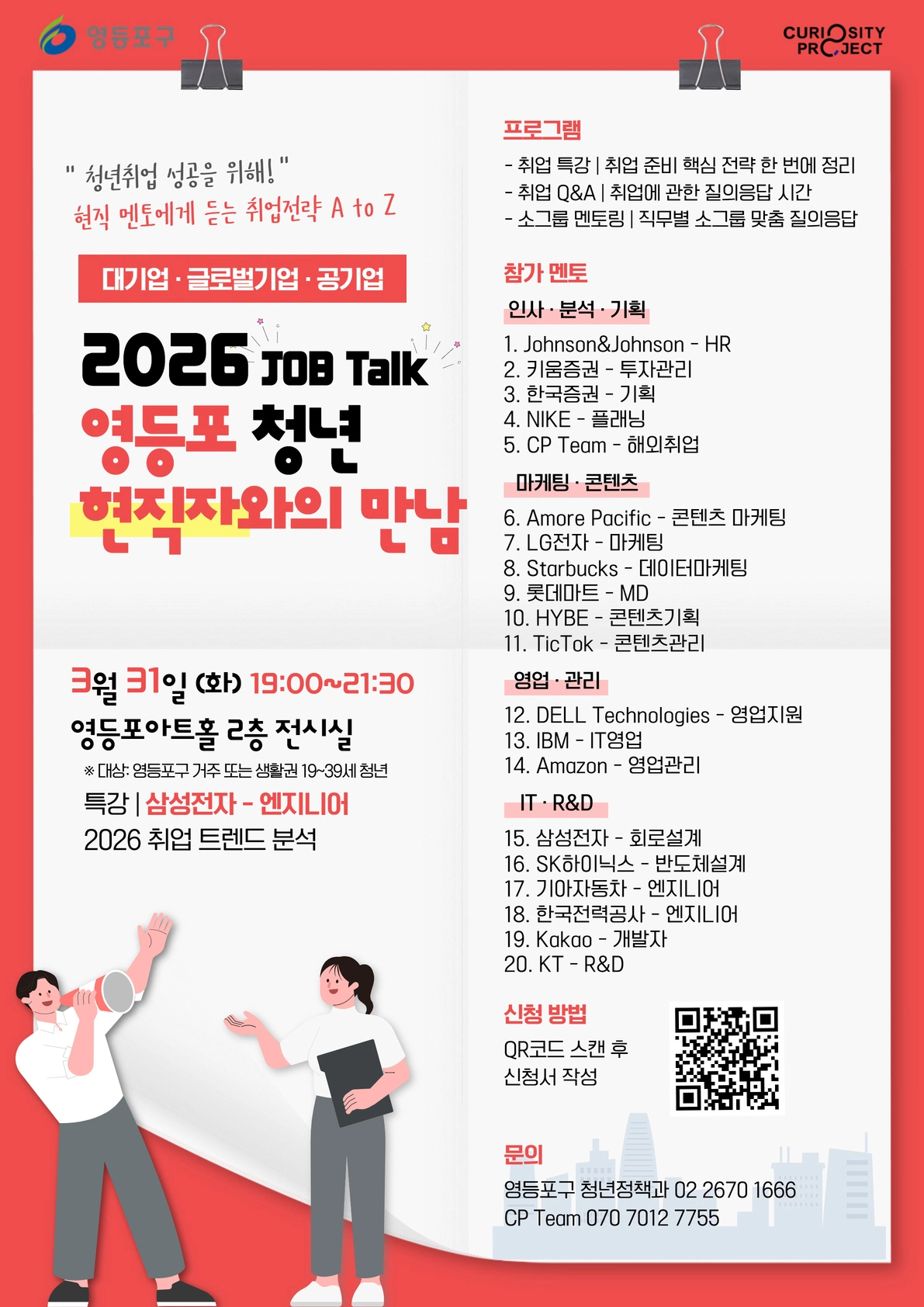서울 영등포구가 오는 31일 영등포아트홀에서 기업의 전·현직자를 초청해 취업 전략을 듣는 ‘현직자와의 만남’을 개최한다고 11일 밝혔다. 이 행사는 청년들이 평소 취업을 희망하는 대기업, 글로벌 기업, 공기업의 전·현직자를 만나 취업 트렌드와 실질적 취업 준비 경험을 들을 수 있는 자리다.