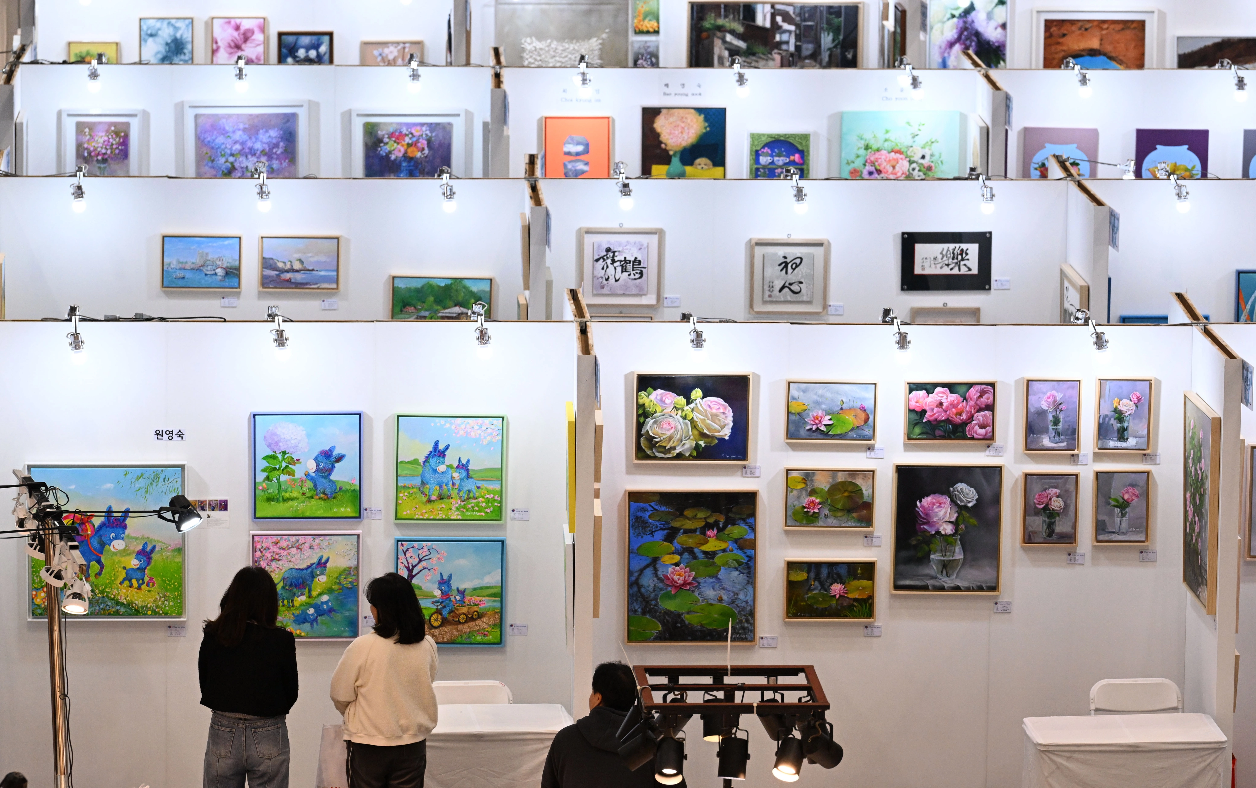 ‘2026 고양 가구엑스포·홈앤리빙 더쇼·큐브 현대미술전’이 경기 킨텍스 제2전시장 10홀에서 12일 열린 가운데 관람객들이 전시장에 걸린 그림들을 둘러보고 있다.