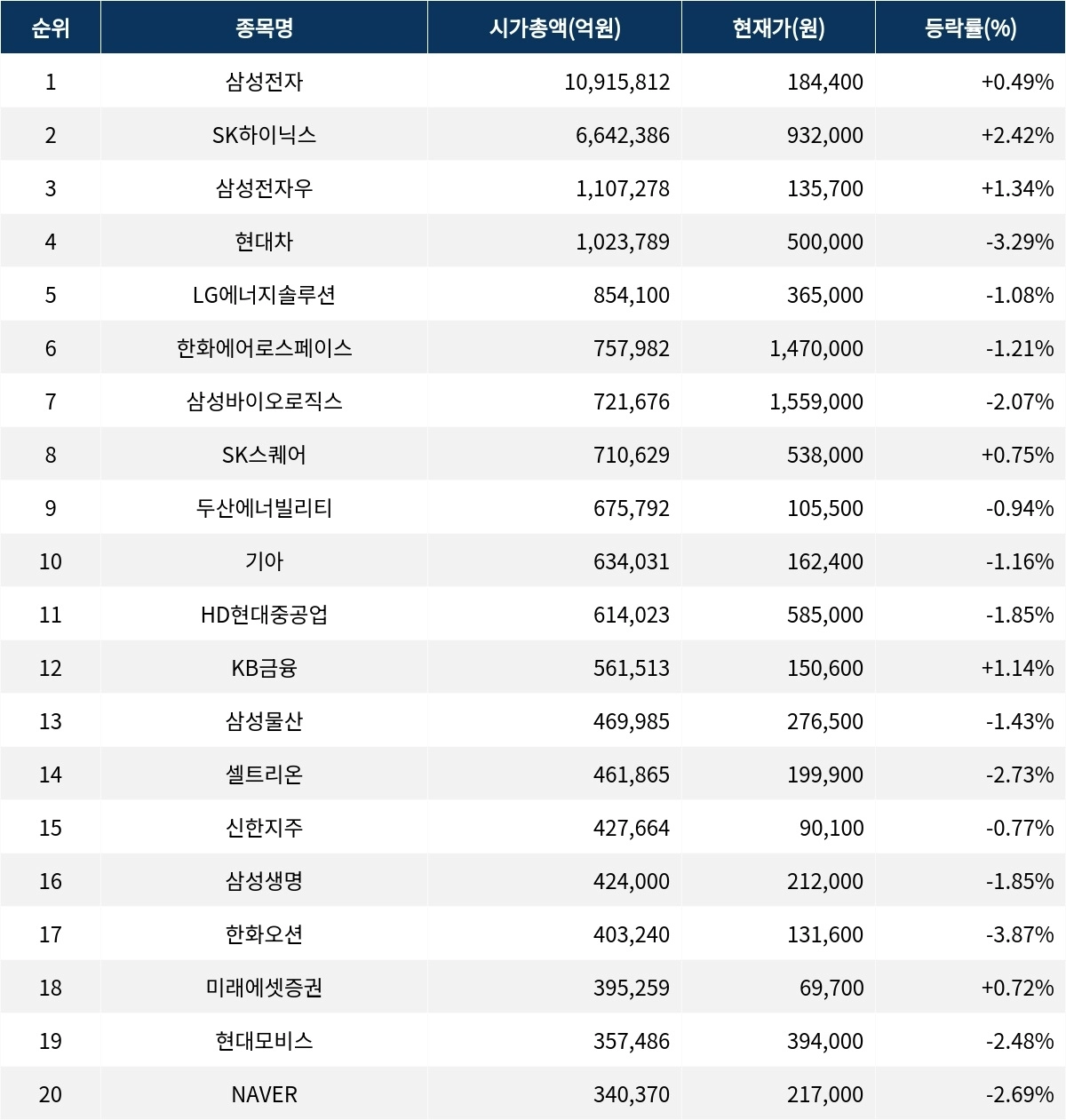 코스피 시가총액 상위 종목들이 전반적으로 엇갈린 흐름을 보이고 있다.