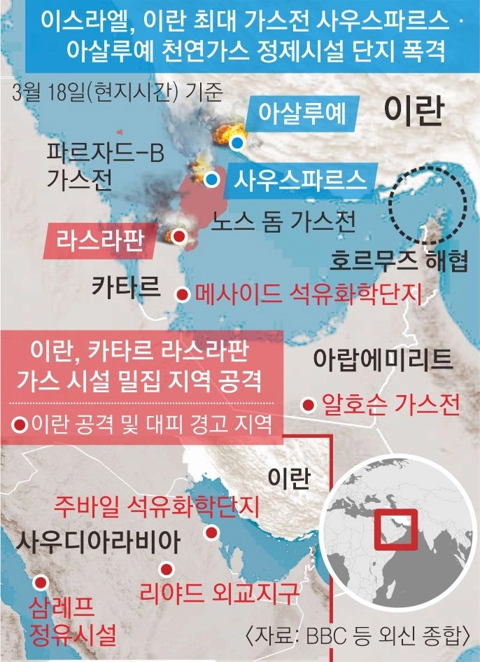 이에 이란은 이튿날 카타르 북부 해안 라스라판 지역의 국가 핵심 에너지 시설을 탄도미사일로 공격했다. 카타르 측에 따르면 가스 액화 시설 등 광범위한 피해가 발생했다. 라스라판은 액화천연가스(LNG)를 비롯해 석유화학, 발전, 담수화 시설 등이 밀집한 카타르 대표 에너지 산업 중심지다. 글로벌 LNG 공급량의 20%를 담당하는 이곳이 멈추면 아시아, 유럽 등 가스 수입국에 타격이 불가피하다.
