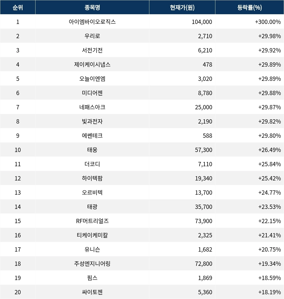 6위 미디어젠(279600)은 8780원으로 29.88% 상승 마감했다. 7위 네패스아크(330860)는 종가 2만 5000원으로 29.87% 상승 마감했다. 8위 빛과전자(069540)는 종가 2190원으로 29.82% 상승 마감했다. 9위 에쎈테크(043340)는 588원으로 29.80% 상승 마감했다. 10위 태웅(044490)은 5만 7300원으로 26.49% 상승 마감했다.