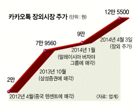 우리나라에도 소프트웨어 파워를 실감하게 하는 대표적인 예가 모바일메신저 ‘카카오톡’을 서비스하는 ‘카카오’다. 이 회사 주식은 현재 장외에서 주당 12만 5500원(3일 기준)에 거래되고 있다. 액면가(500원)의 251배에 달한다. 지난 1월엔 말레이시아의 버자야 그룹이 카카오 지분 0.4%를 110억원(주당 9만원)에 사들이기도 했다.