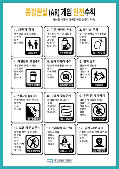 ‘열사병 주의’, ‘개인정보 보안주의’, ‘보행 중 전방 주시’도 수칙에 담았다. 낮에 오랫동안 게임에 빠져 열사병에 쓰러지거나 전방 주시를 게을리해 일어나는 사고를 막기 위해서다.