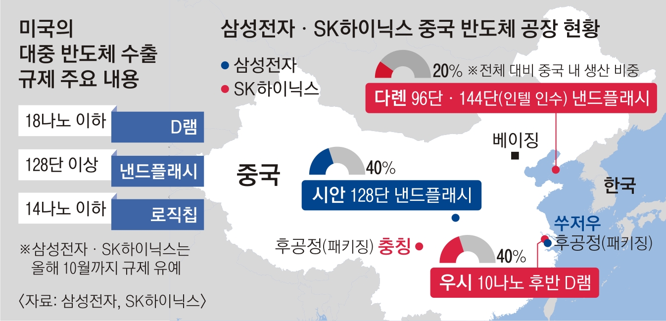 이는 두 기업의 중국 공장 설비 투자를 막겠다는 의미로 풀이된다. 삼성전자는 중국 시안에서 128단 낸드플래시를, SK하이닉스는 우시 공장에서 10나노미터(㎚·1나노미터는 10억분의1m) 후반대 D램과 다롄 공장에서 96·144단 낸드플래시를 생산하고 있다.