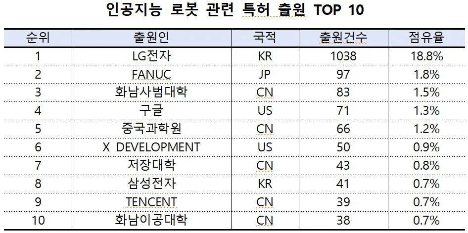 출원인 국적은 중국이 60.0%(3313건)를 차지한 가운데 한국(1367건), 미국(446건), 일본(235건)이 뒤를 이었다. 다 출원인은 LG전자가 전체 18.8%(1038건)로 압도적 1위에 올랐다. 이어 일본 FANUC(97건), 중국 화남사범대학(83건), 미국 구글(71건), 중국과학원(66건) 등의 순이다. 상위 10개 다 출원인 중 삼성전자가 8위(41건)에 올라 한국과 중국 간 기술 경쟁이 치열한 것으로 분석됐다.