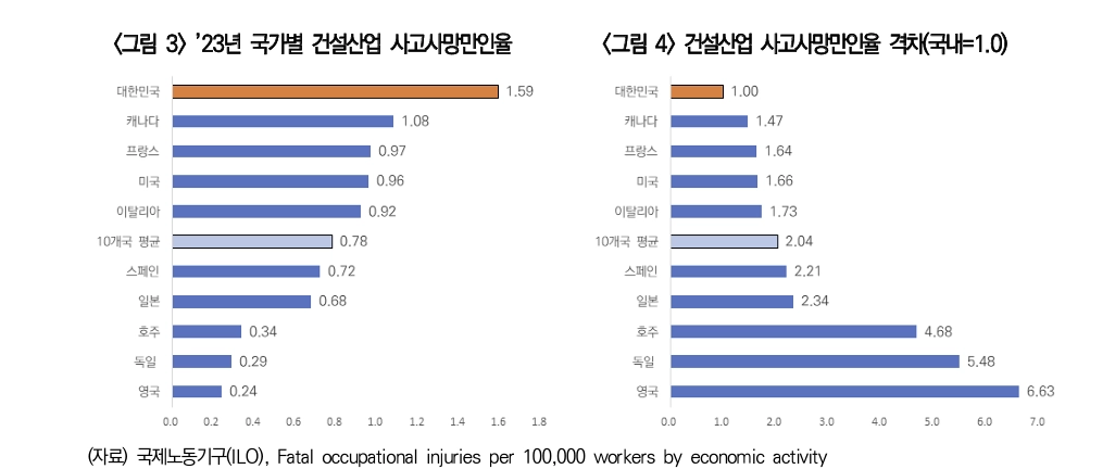 건설업을 포함해 한국의 전체 산업 사고사망만인율은 2023년 기준 0.37로, OECD 경제 10대국 중 캐나다(0.50) 다음으로 높았다. 이어 미국(0.37), 프랑스(0.35), 이탈리아(0.20), 스페인(0.17), 호주(0.14), 일본(0.13), 독일(0.07), 영국(0.04)의 순이었다.