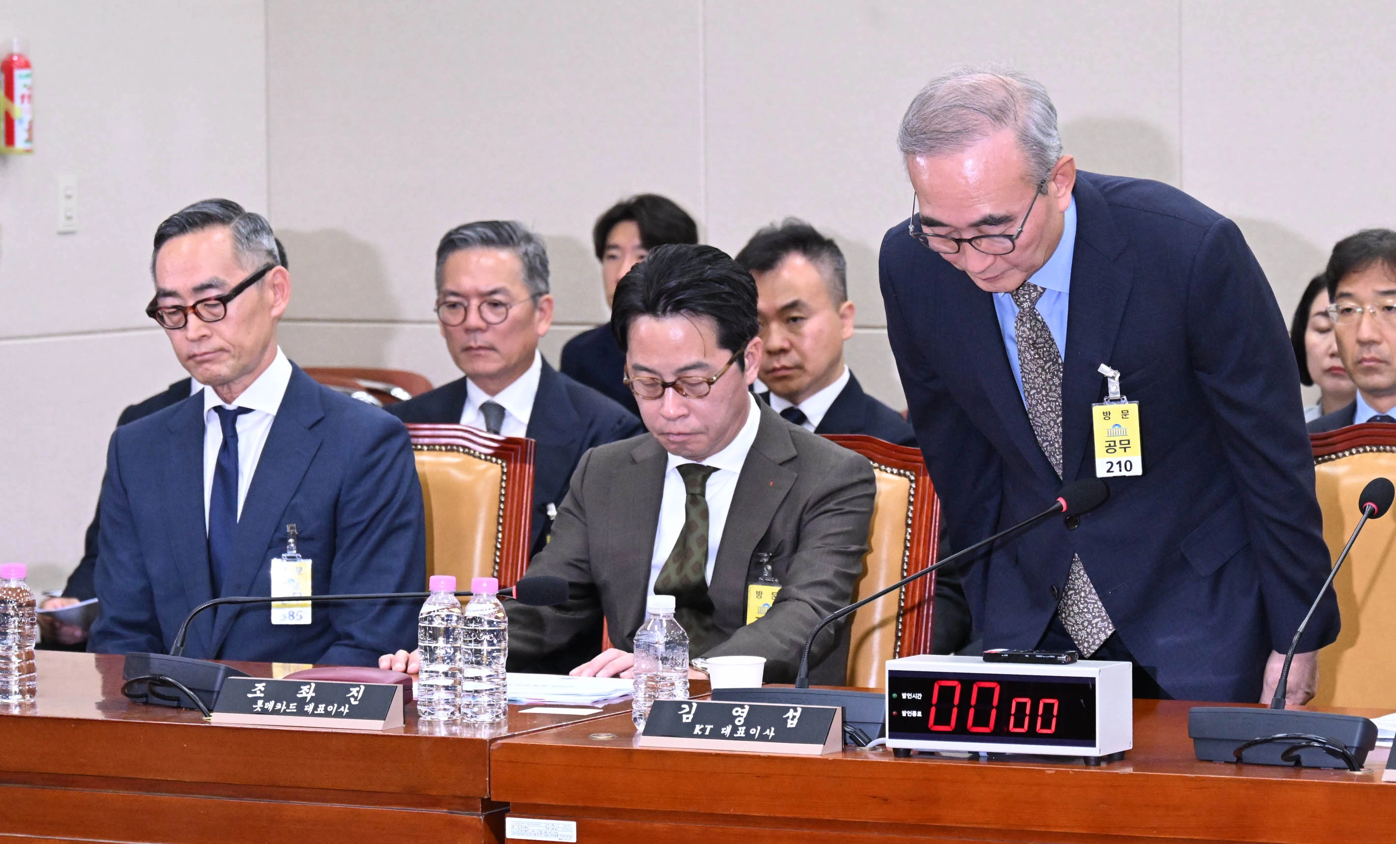 고개 숙인 KT 대표  대규모 해킹 사고로 물의를 빚은 KT와 롯데카드 고위 관계자들이 나란히 국회 과학기술정보방송통신위원회 ‘통신·금융 해킹사태 청문회’에 출석했다. 24일 김영섭 KT 대표가 청문회에서 고개 숙여 인사하고 있다. 맨 왼쪽부터 윤종하 MBK파트너스 부회장, 조좌진 롯데카드 대표, 김 대표.