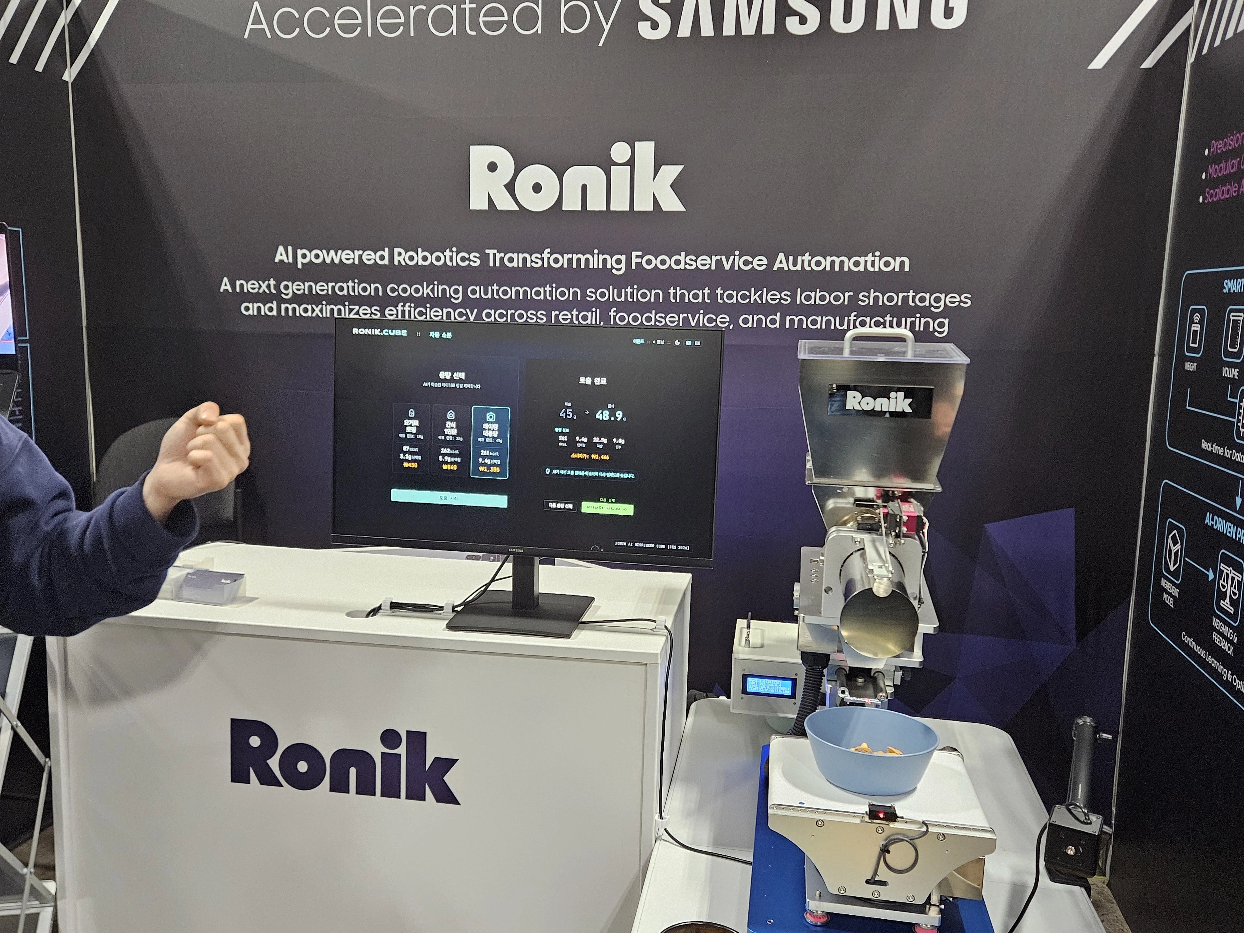 7일(현지시간) 국내외 유명 스타트업들이 모인 라스베이거스 베네치안 엑스포에 마련된 삼성전자 C랩 부스에서는 가장 먼저 자동화 조리 로봇 솔루션 스타트업 ‘로닉’이 눈에 들어왔다. 로닉은 로보틱스 기술과 AI를 접목해 외식 자동화 조리 솔루션을 개발하는 회사다. 이날 부스에서는 조리 로봇이 다양한 식재료를 계량하고 투입하는 모습을 선보여 관람객들의 시선을 사로잡았다. 로봇이 다량의 아몬드를 접시에 떨어뜨리면 AI 컴퓨터가 카메라와 센서 등을 활용해 식재료의 상태와 종류를 식별하고 영양 성분과 원가율 등을 추정·산출하는 식이다. 오진환 로닉 대표는 “같은 식재료라도 크기, 무게, 부피가 달라 매번 똑같은 제어 방식으로 하면 제대로 된 맛이 안 나는 경우가 많은데 이제는 이를 정확히 분류해서 맞춤형 도시락 등을 만들 수 있다”고 설명했다.