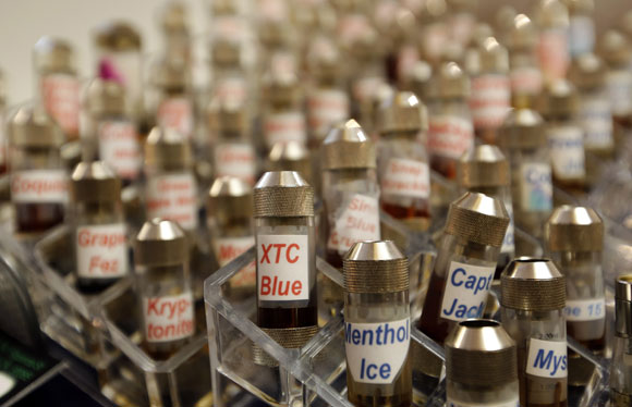 4일(현지시간) 미국 캘리포니아주 로스앤젤레스에 있는, 전자담배 및 관련 상품을 판매하는 상점인 베이프오로지 LA에 여러 가지 담배향 액체가 담긴 유리병이 진열돼 있다. 이날 로스앤젤레스 시의회는 공공장소에서의 전자담배 흡연 금지 조례안을 표결에 부쳐 찬성 14표, 반대 0표 만장일치로 통과시켰다.