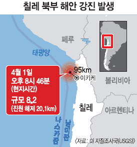 미국 지질조사국(USGS)은 1일 오후 8시 46분(현지시간) 칠레 북부 태평양 연안 항구도시 이키케에서 북서쪽으로 95㎞ 떨어진 지점의 깊이 20.1㎞ 해저에서 규모 8.2의 지진이 발생했다고 밝혔다. 태평양쓰나미경보센터(PTWC)는 중남미의 태평양 연안 전체에 쓰나미 경보를 발령했다가 몇 시간 뒤에 해제했다. 지진 발생 45분 만에 높이 2m의 쓰나미가 칠레 북부 해안을 덮쳤으나 큰 피해는 신고되지 않았다.