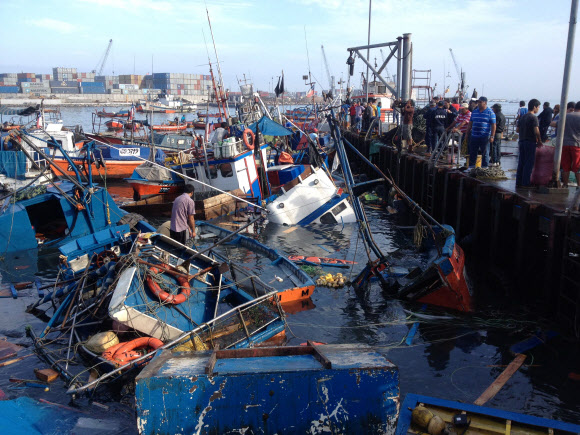 고깃배 덮친 칠레 쓰나미  규모 8.2의 강진이 강타한 다음날인 2일 칠레 북부 태평양 연안 항구도시 이키케의 한 부두에 높이 2m의 쓰나미가 덮치면서 부서진 작은 고깃배들이 어지럽게 널브러져 있다.<br>이키케 AFP 연합뉴스