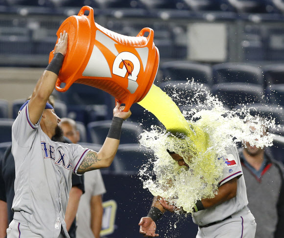 미국 텍사스 레인저스가 28일(현지시간) 뉴욕 양키스를 9대 6으로 제패한 뒤 2루수인 루그네드 오도어(왼쪽)가 유격수 엘비스 앤드루스에게 커다란 통에 담긴 게토레이 음료를 붓고 있다. 사진=AP연합뉴스
