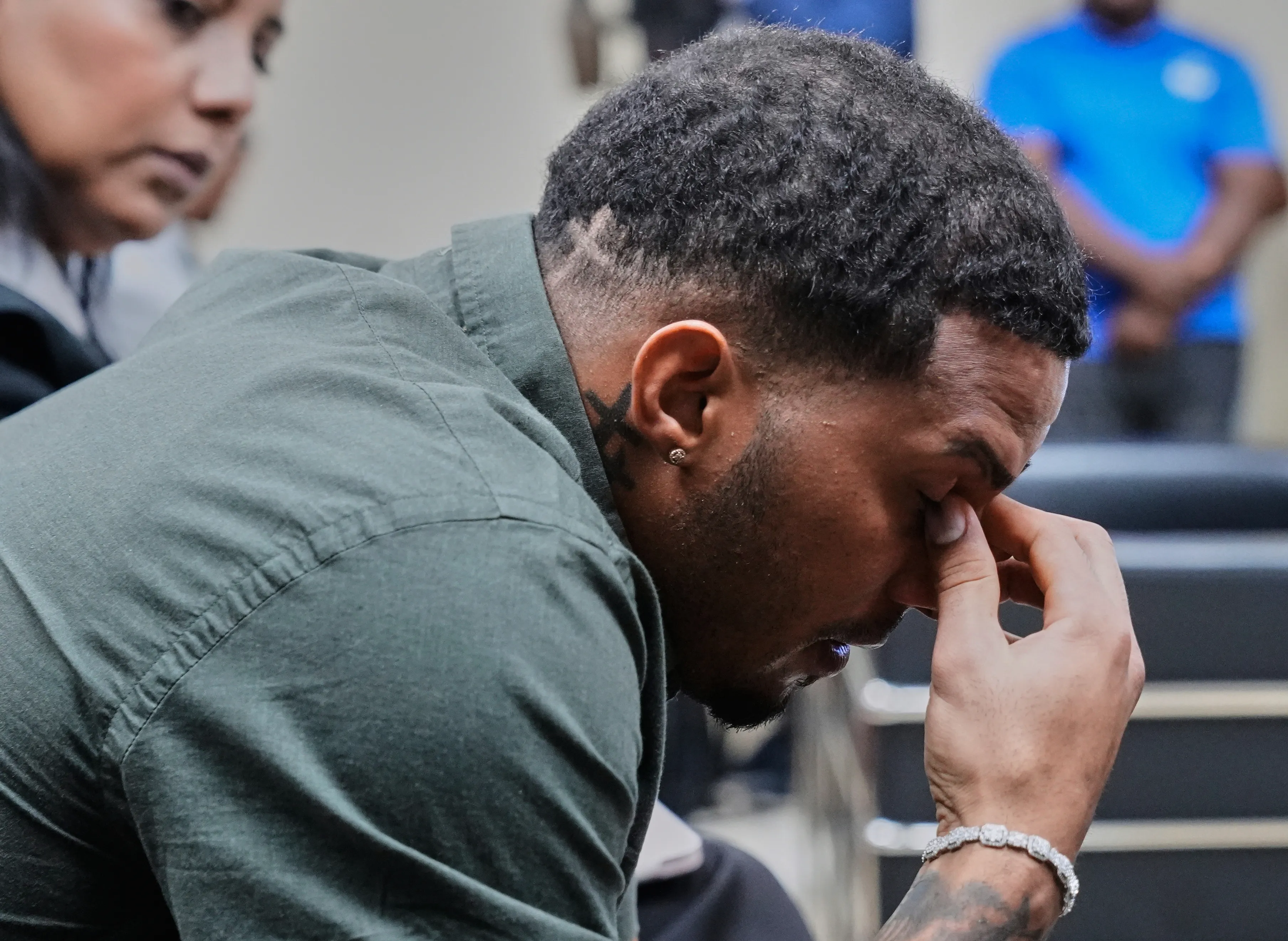 완데르 프랑코가 26일(현지시간) 도미니카공화국 푸에르토 플라타 법원에서 성 착취 혐의에 대한 유죄를 선고 받은 직후 눈물을 훔치고 있다. 푸에르토 플라타 AP 연합뉴스