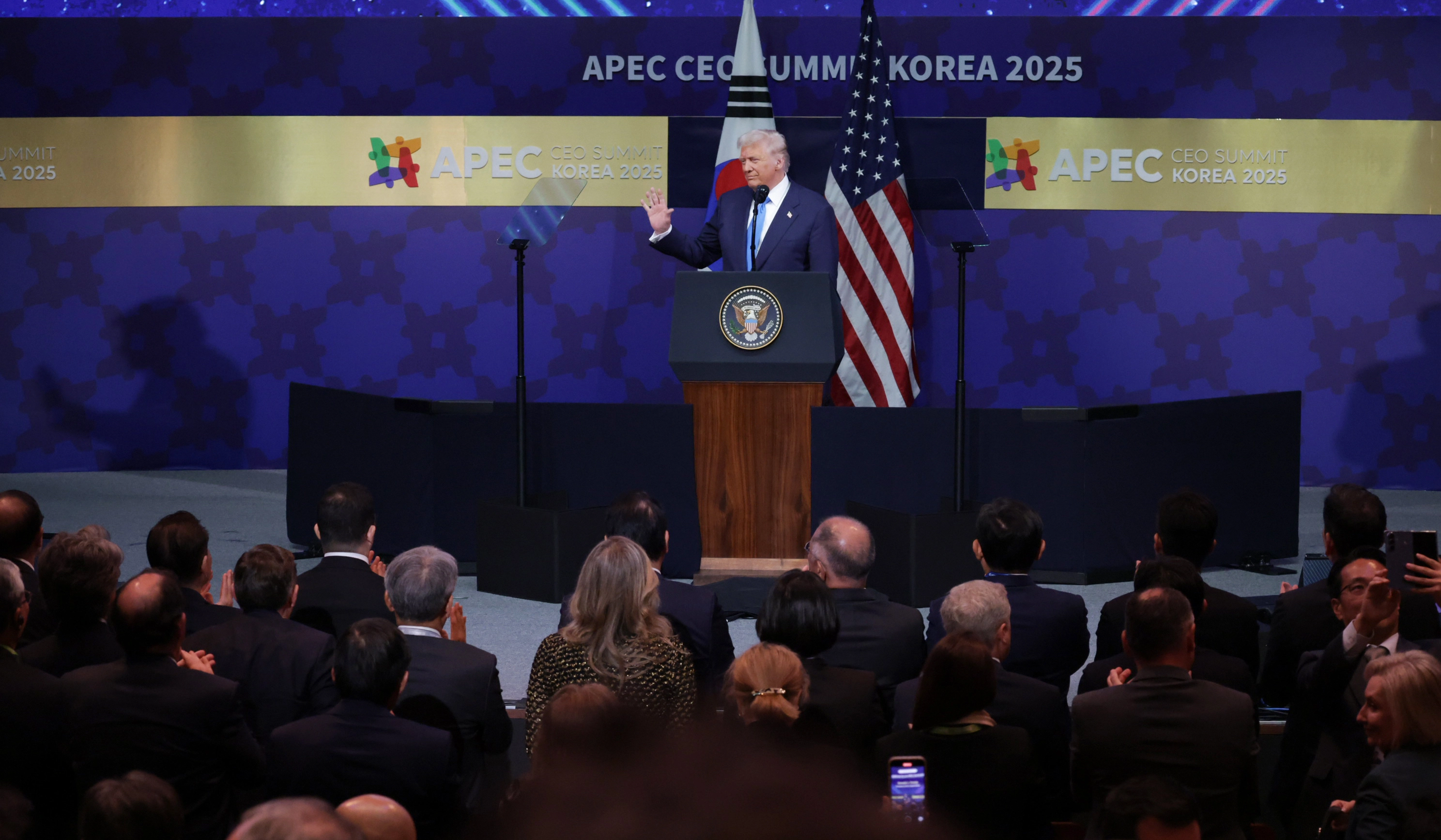트럼프 대통령은 이날 경주에서 열린 아시아태평양경제협력체(APEC) 최고경영자(CEO) 서밋의 특별연설에서 “실제 우리는 조선업에서 한국과 협력하고 있다”며 이같이 말했다.
