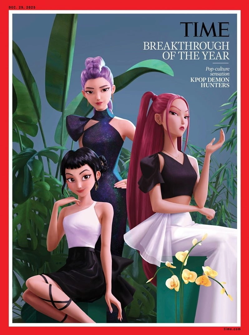 9일(현지시간) 미국 시사주간지 타임은 케데헌을 ‘2025 올해의 돌파구(Breakthrough of the Year)’로 선정하고, 12월 29일자 표지에 주역 캐릭터 루미·미라·조이를 전면 배치했다.