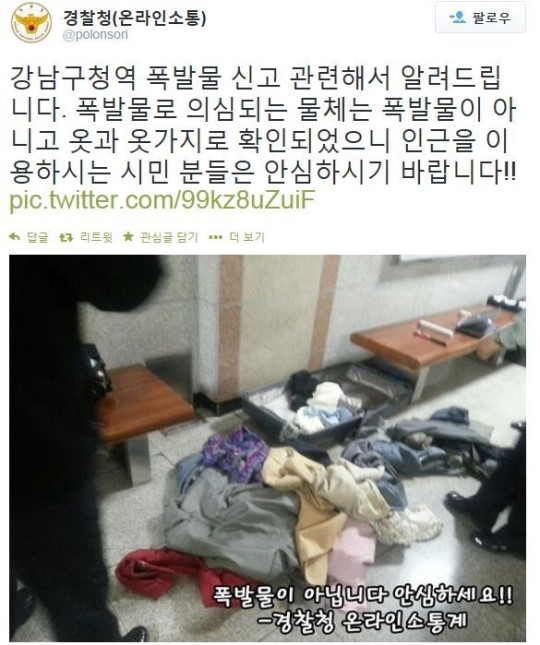 경찰 관계자는 이날 “(분당선 강남구청역에서) 폭발물이 든 것으로 의심되는 가방을 발견해 해체작업을 한 결과 폭발물이 아닌 것으로 확인됐다”고 말했다.
