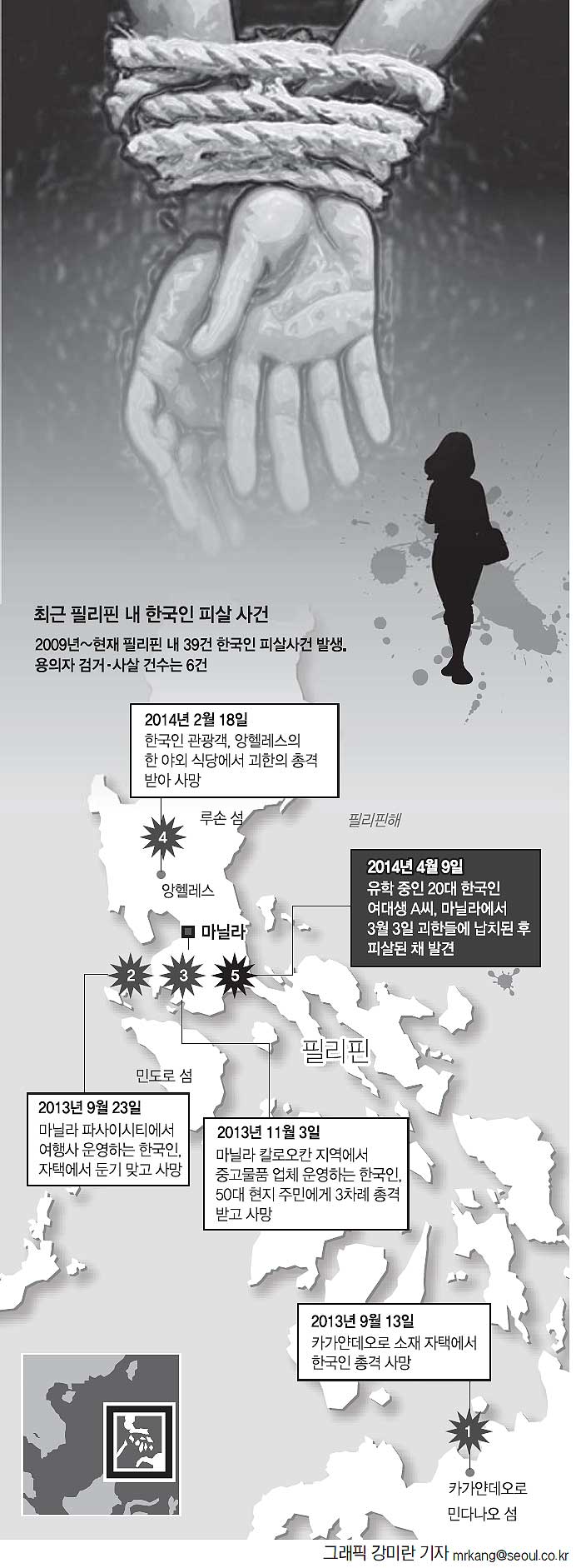 칼로오칸시는 마닐라에서 차량으로 1시간여 거리에 있는 북쪽 외곽의 대표적인 빈민가 지역으로, 지난해 11월에도 40대 한국인 남성이 피살된 채 발견됐던 곳이다.