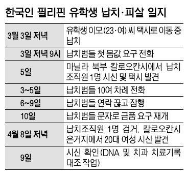9일 시신으로 발견된 이씨가 납치된 건 지난달 3일(현지시간) 저녁. 마닐라 파사이시에서 살며 현지 대학에 재학 중이던 이씨는 친구와 만나기 위해 택시를 타고 이동하다 피랍됐다. 우리 국민이 필리핀 수도인 마닐라에서 납치돼 피살된 건 이번이 처음이다.