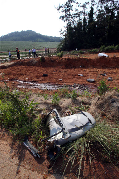 17일 오후 3시 9분께 전남 무안군 현경면 야산의 밭에 4인승 경비행기 한 대가 추락했다. 사고로 조종사 교관과 교육생 등 탑승객 3명이 현장에서 숨졌다. 이들은 무안공항에 입주한 민간 조종사교육원 소속으로, 무안공항 이착륙 훈련을 하던 도중 사고가 난 것으로 알려졌다. 2016.6.17